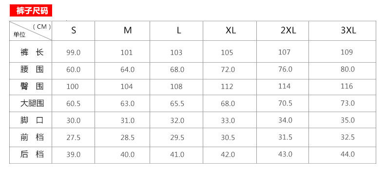 Outseam (cm) 99 cm 101.5 cm 104 cm 106.5 cm 109 cm