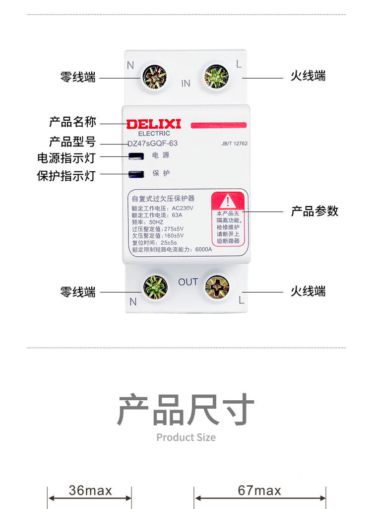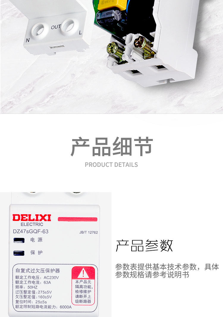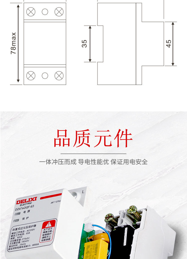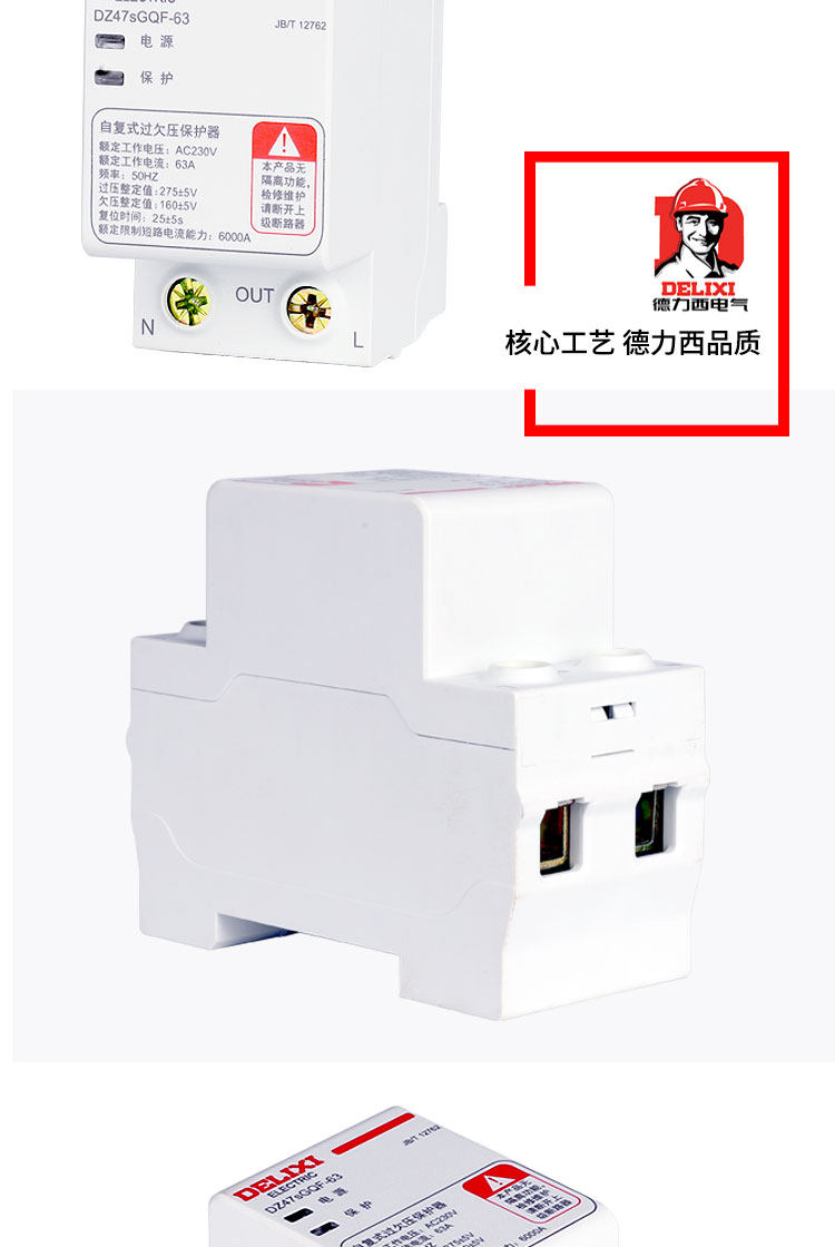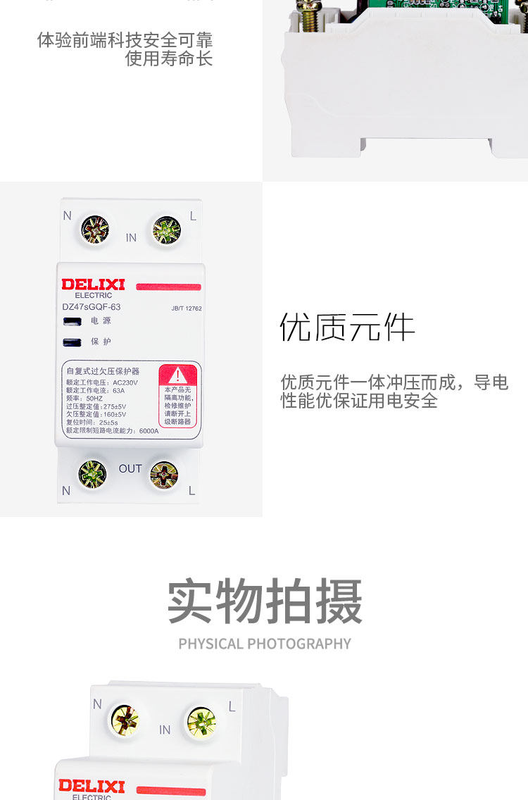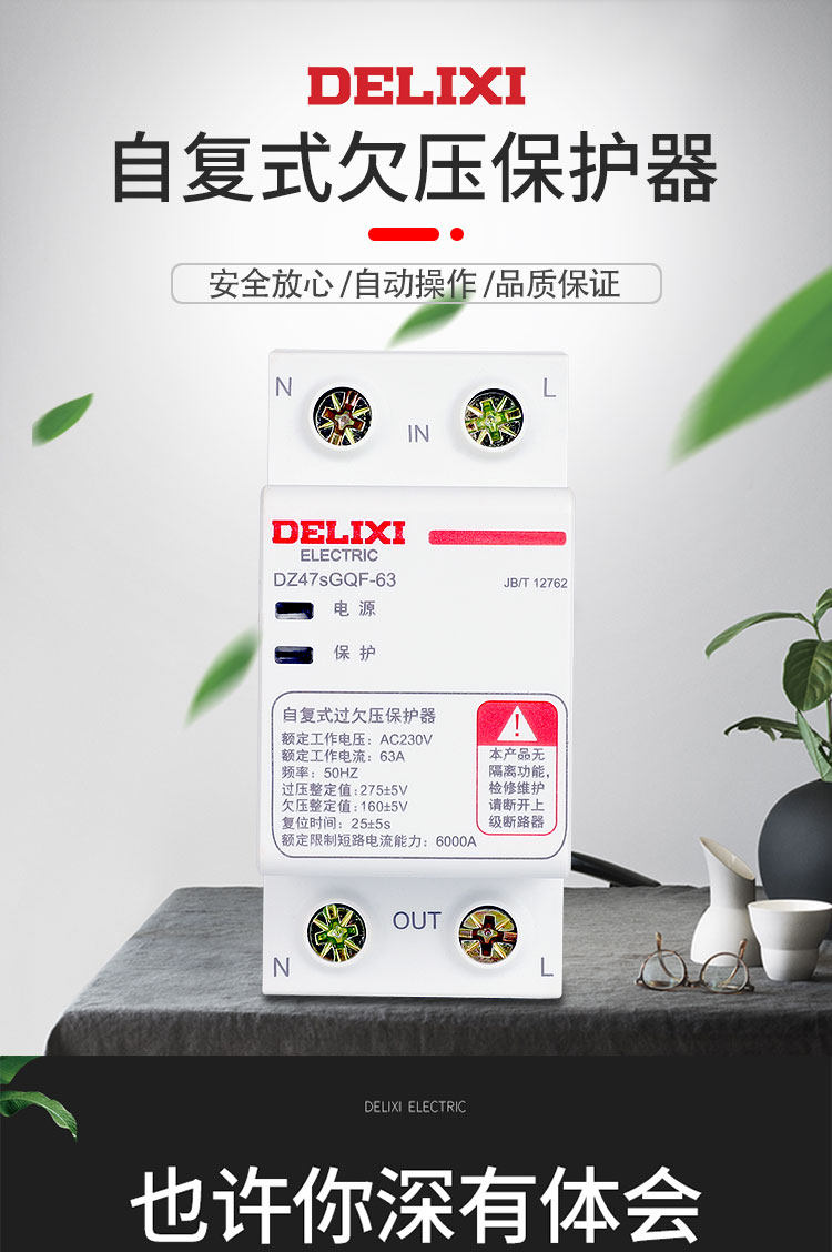 Delixi Self-Resetting Over-Voltage and Under-Voltage Circuit Breaker, Top-In, Bottom-Out, Dz47Sgqf-63, 63A, 1P+N, Under-Voltage Protection, Over-Voltage Protection