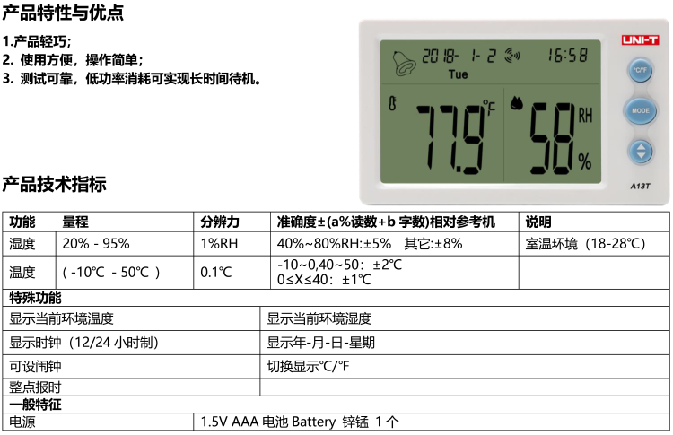 Unilide A10T/A12T/A13T Digital Temperature and Humidity Meter Laboratory Household Temperature/Humidity Digital Record