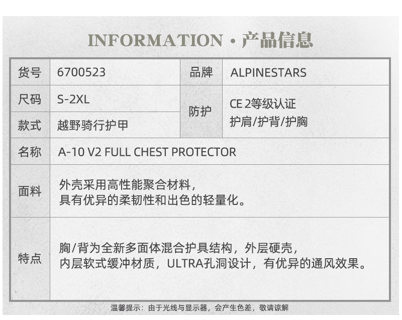 Alpinestars Armor a Star A10 Off-Road Armor Motorcycle Riding Chest Armor Anti-Fall Full Armor Riding Equipment