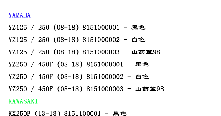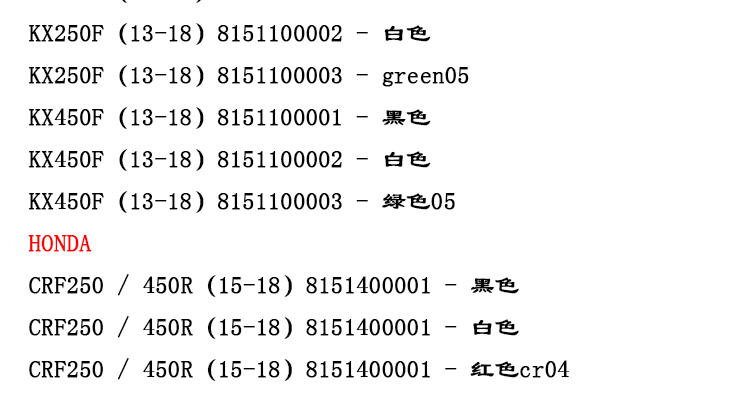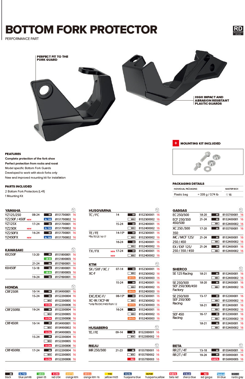 Color Classification Kawasaki Green,Ktm Husqvarna Gas Gas Black,Ktm Husqvarna Gas Gas Orange,Honda Crf250R/450R Black,Honda Crf250R/450R Red,Kawasaki 2 Green,Yamaha 2 Blue,Ktm Hu Si Shock Absorber Lower Protection Orange 8152400003,Ktm Husky Shock Absorber Lower Guard Black 8152400001