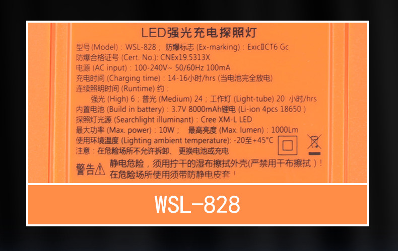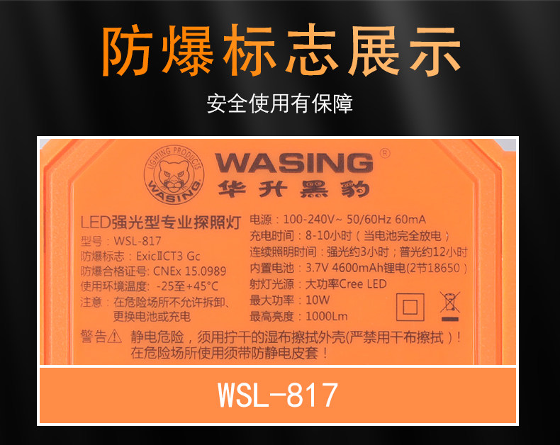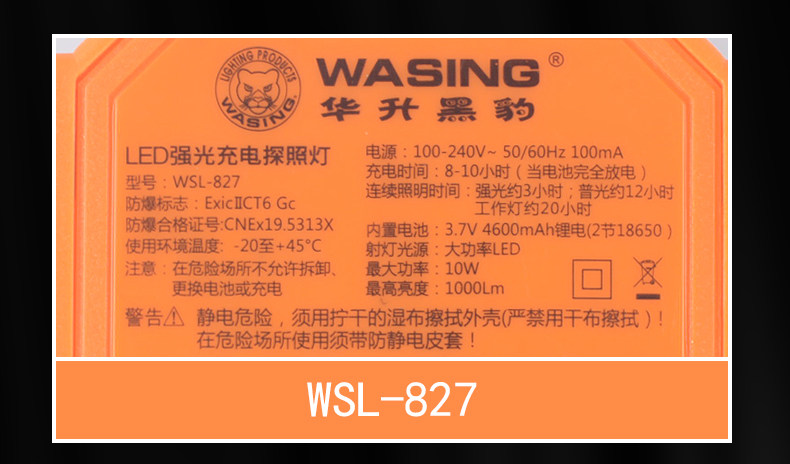 Huasheng Black Panther Wsl-817/827/828 Strong Light Rechargeable Led Explosion-Proof Searchlight for Gas Stations and Chemical Plants