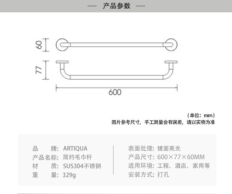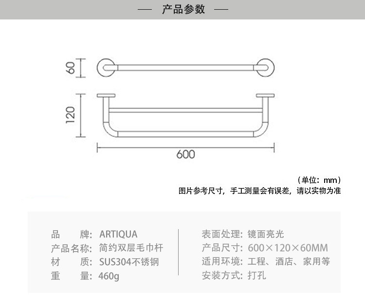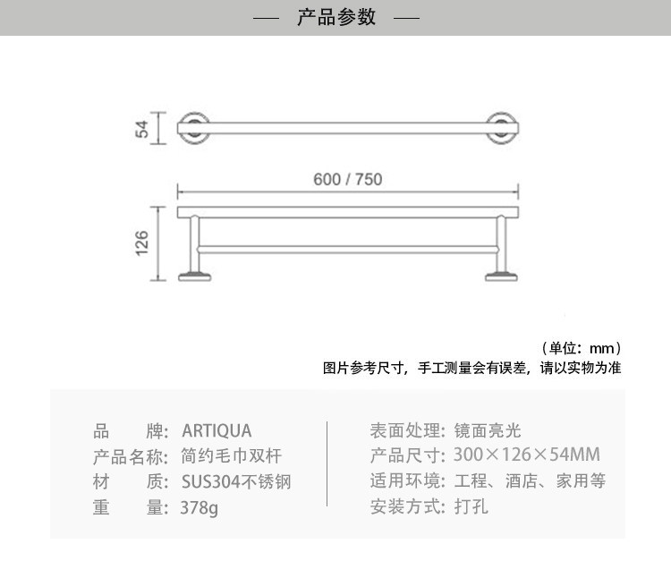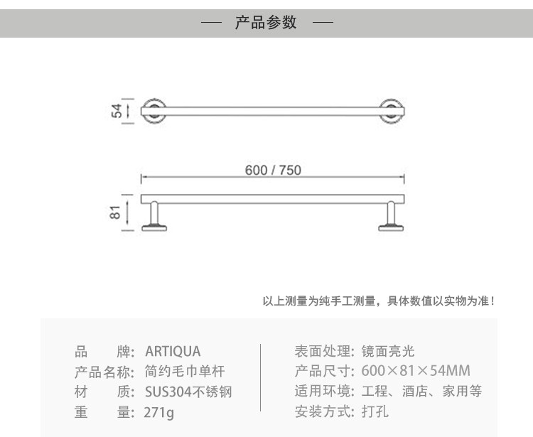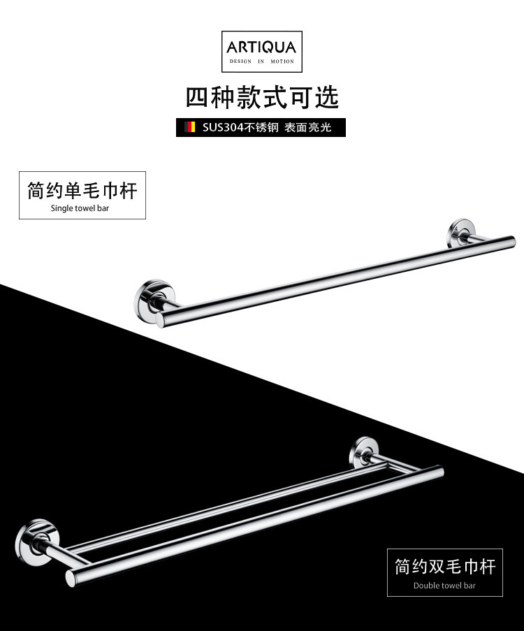 Artiqua 304 Stainless Steel Towel Bar Single Bar Double Bar Towel Rack Towel Holder Glossy Hardware Accessories