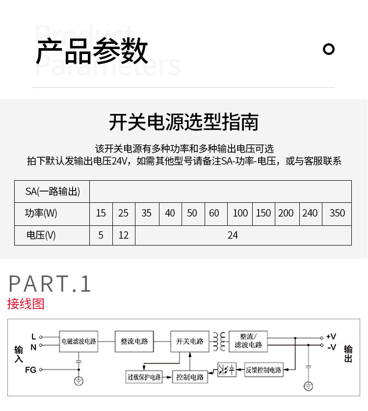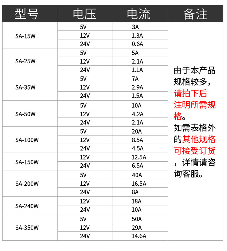 Color Classification Single Output 15W-24V (0.7A),Single Output 25W-24V (1.1A),Single Output 35W-24V (1.5A),Single Output 50W-24V (2.1A),Single Output 100W-24V (4.5A),Single Output 150W-24V (6.5A),Single Output 200W-24V (8A),Single Output 240W-24V (10A),Single Output 350W-24V (14.6A),Single Output 480W 24V (20A),Single Output 500W-24V (20A),Single Output 25W-12V (2.1A),Single Output 35W-12V (2.9A),Single Output 50W-12V (4.2A),Single Output 100W-12V (8.5A),Single Output 150W-12V (12.5A),Single Output 200W-12V (16.5A),Single Output 240W-12V (18A),Single Output 350W-12V (29A),Single Output 100W-5V (18A)