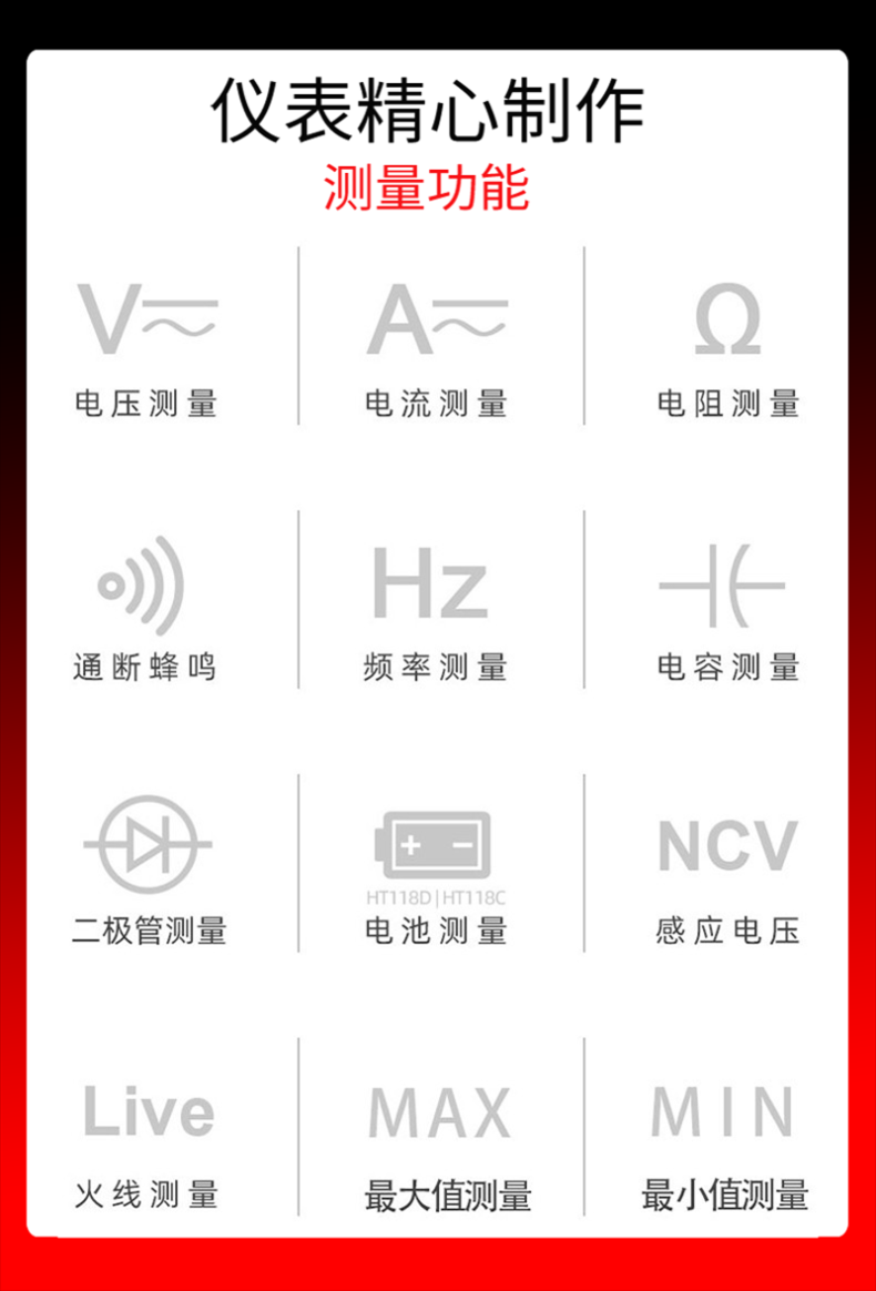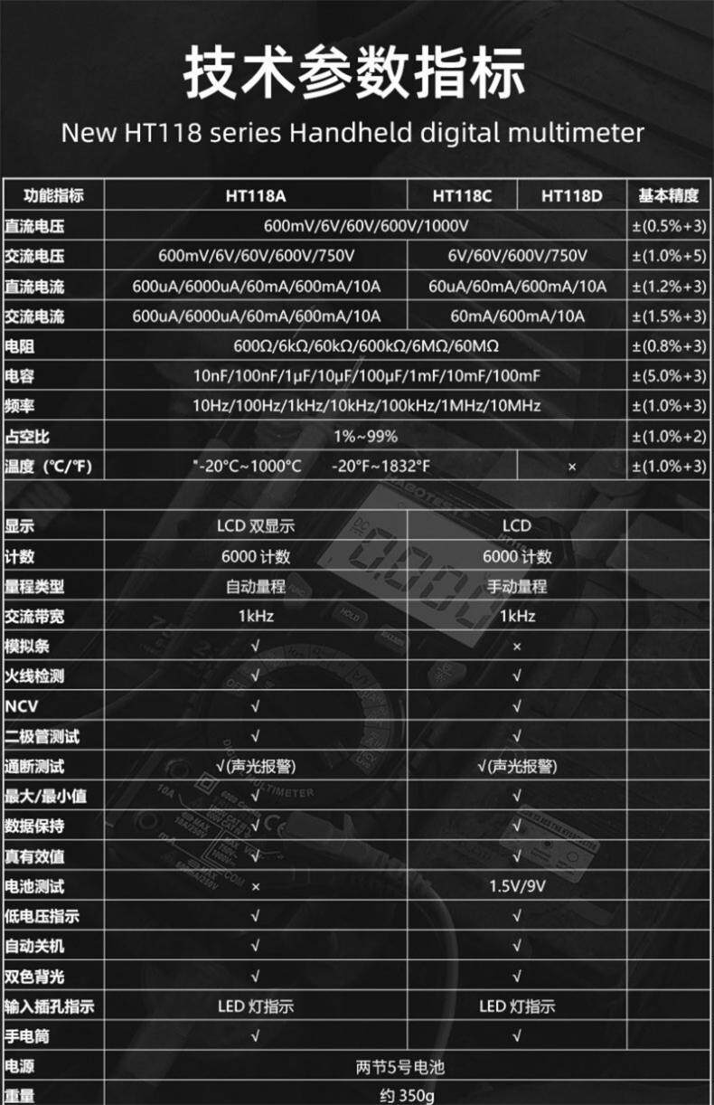 Color Classification Ht118D [Manual Range],Ht118C [Manual Range],Ht118A [Automatic Range],Ht118D Comes Standard with +20A Sharp Test Leads,Ht118C+20A Pointed Test Pen,Ht118A+20A Pointed Test Pen