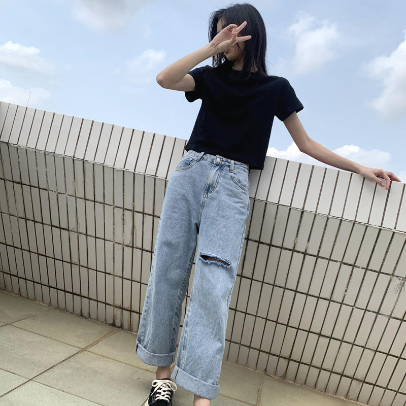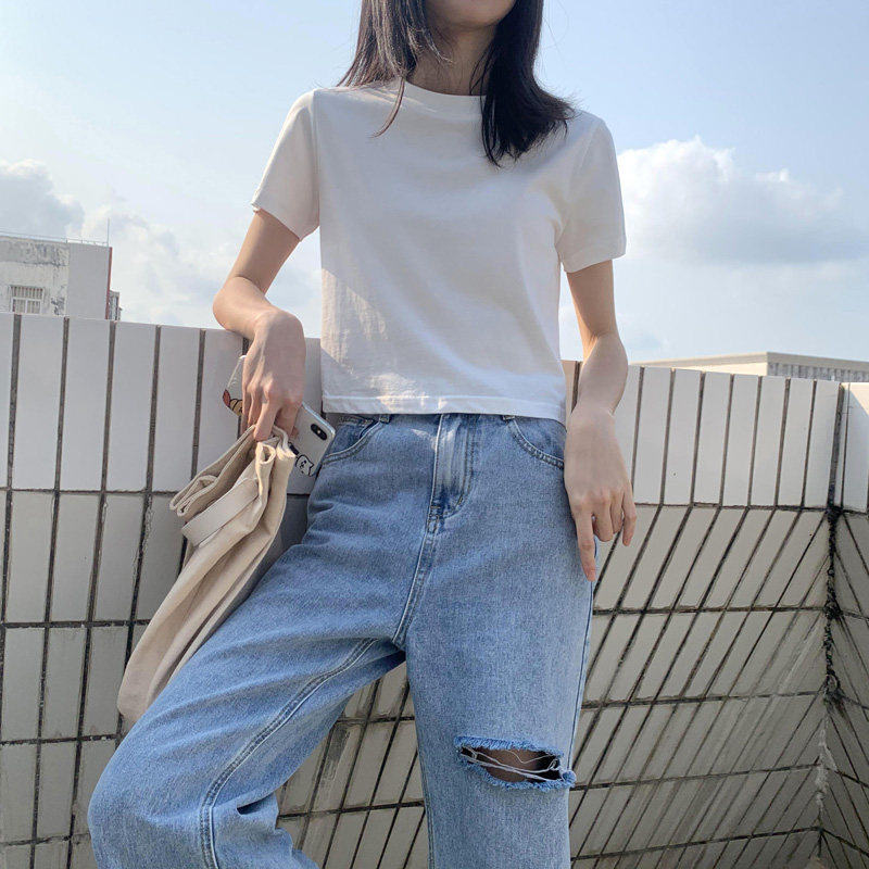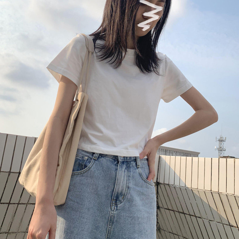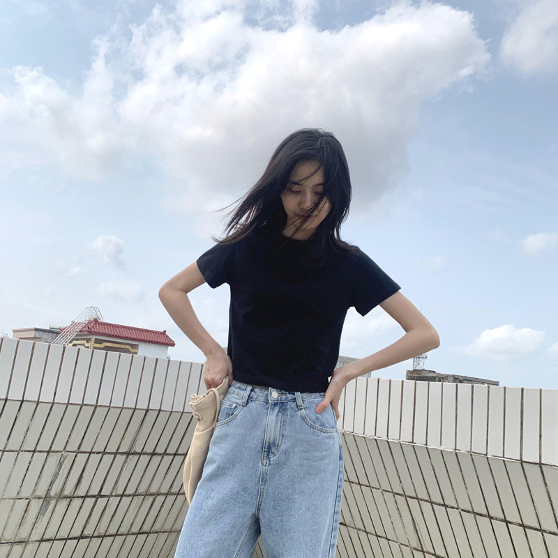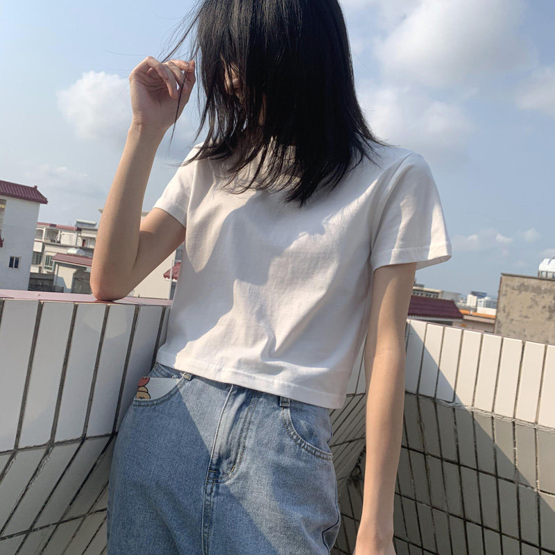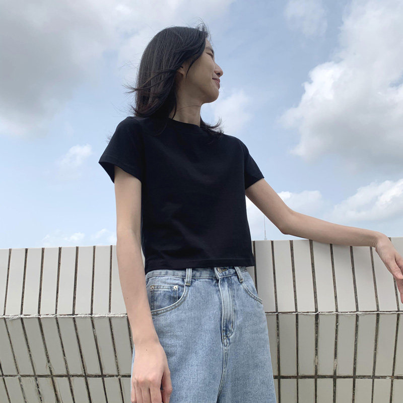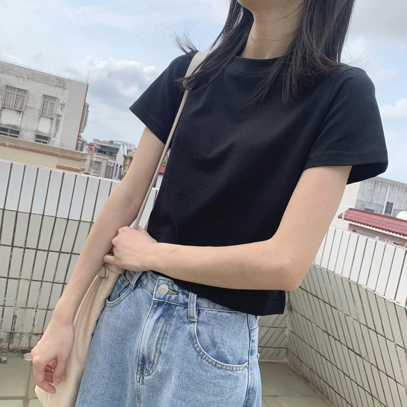 Black short t-shirt for women Korean version ins high waist slim cotton slim fit navel-baring short-sleeved summer petite bottoming shirt trendy
