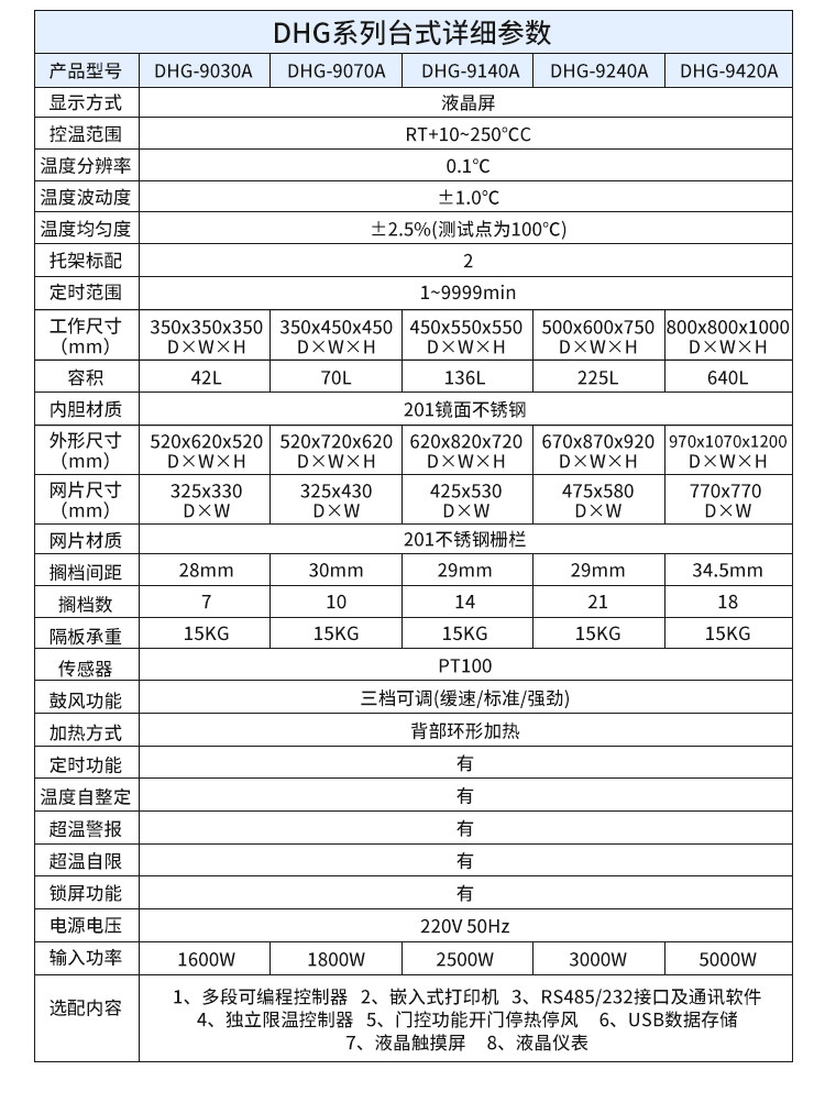 Color Classification Dhg-9030A Desktop (42 Liters 250 Degrees),Dhg-9070A Desktop (70 Liters 250 Degrees),Dhg-9140A Desktop (136 Liters 250 Degrees),Dhg-9240A Desktop (225 Liters 250 Degrees),Dhg-9420A Desktop (640 Liters 250 Degrees),Dhg-9036A Vertical (42 Liters 300 Degrees),Dhg-9076A Vertical (70 Liters 300 Degrees),Dhg-9146A Vertical (136 Liters 300 Degrees),Dhg-9246A Vertical (250 Liters 300 Degrees),Dhg-9426A Vertical (640 Liters 300 Degrees),Dhg–9030A
