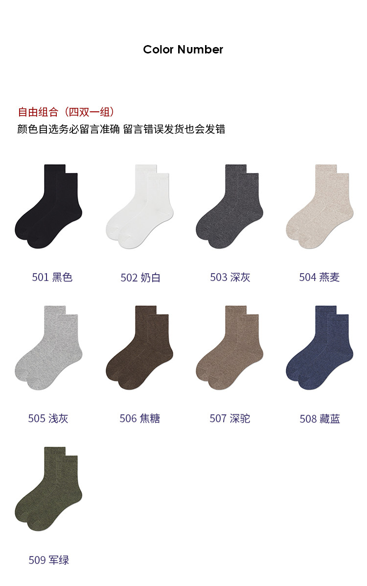 Color Classification Milk White + Light Gray + Dark Gray + Black,Milk White + Oatmeal + Dark Camel + Caramel,Light Gray + Oatmeal + Dark Camel + Caramel,Light Gray + Dark Gray + Dark Camel + Caramel,Light Gray + Dark Gray + Navy Blue + Black,Dark Gray + Military Green + Navy Blue + Black,Dark Camel + Caramel + Navy Blue + Military Green,Two Pairs of Milk White + Two Pairs of Black,Two Pairs of Light Gray + Two Pairs of Dark Gray,Four Pairs of Milky White,Four Pairs of Black,Four Pairs of Your Choice,Remark Number