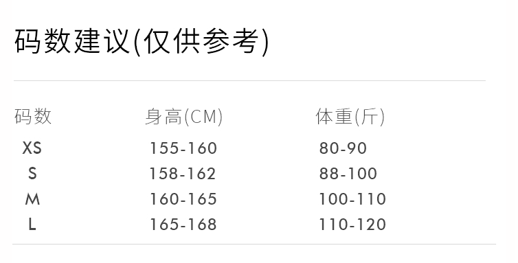 China (cm) 160-165/84-86 165-170 / 88-90 167-172 / 92-96 168-173 / 98-102 170-176 / 106-110