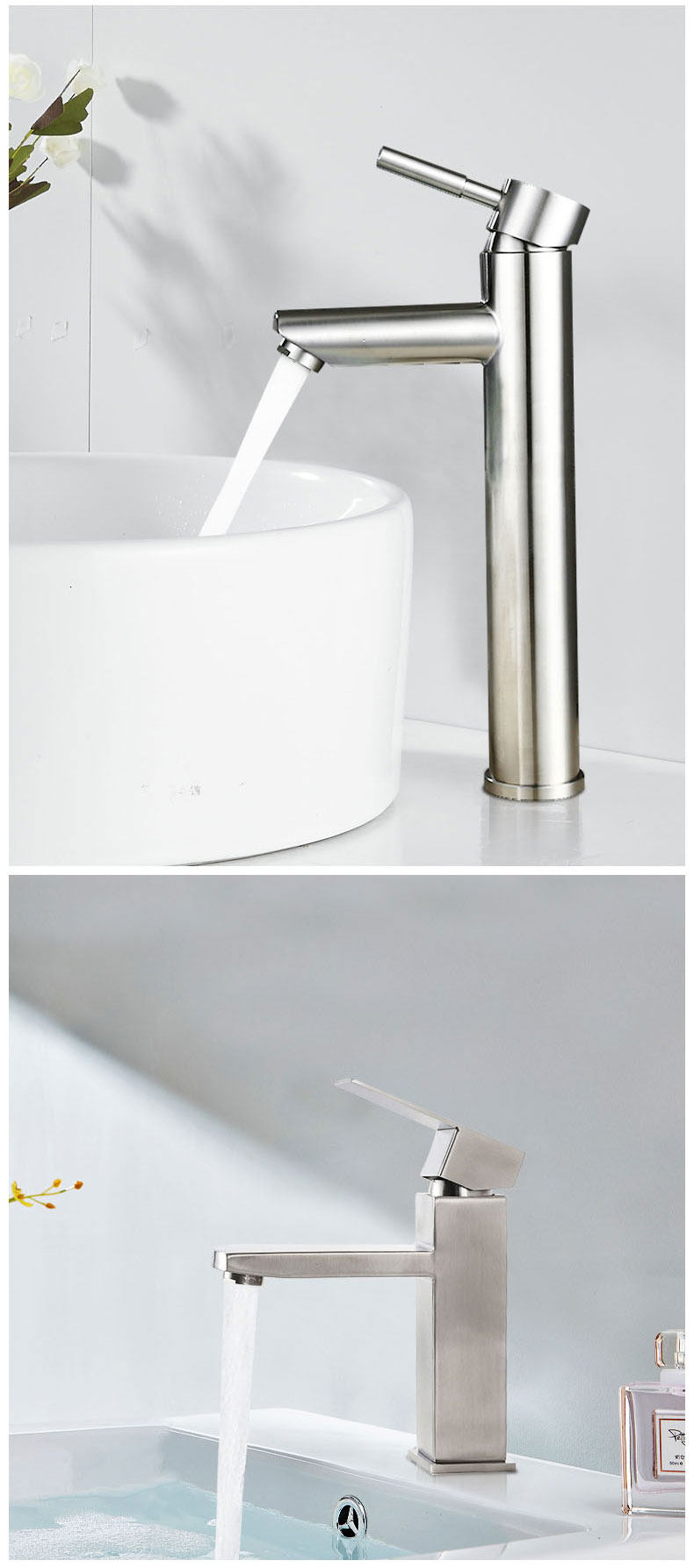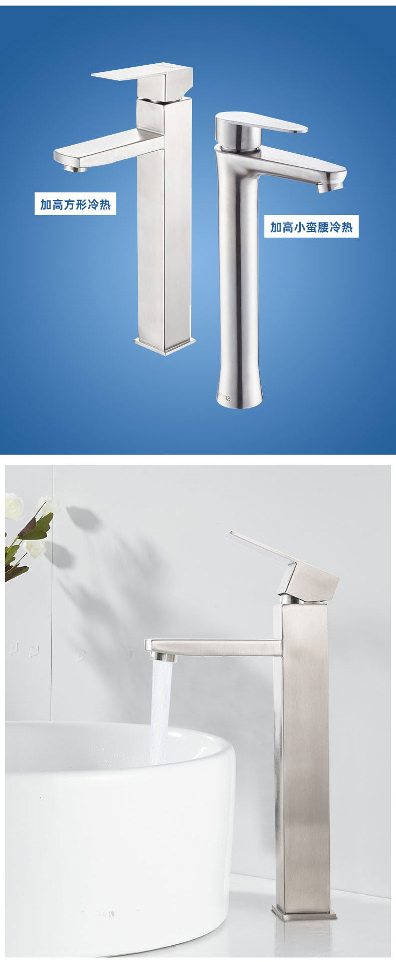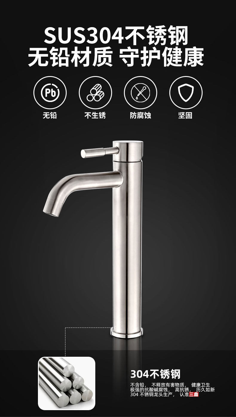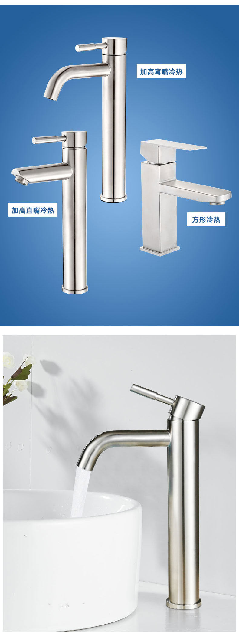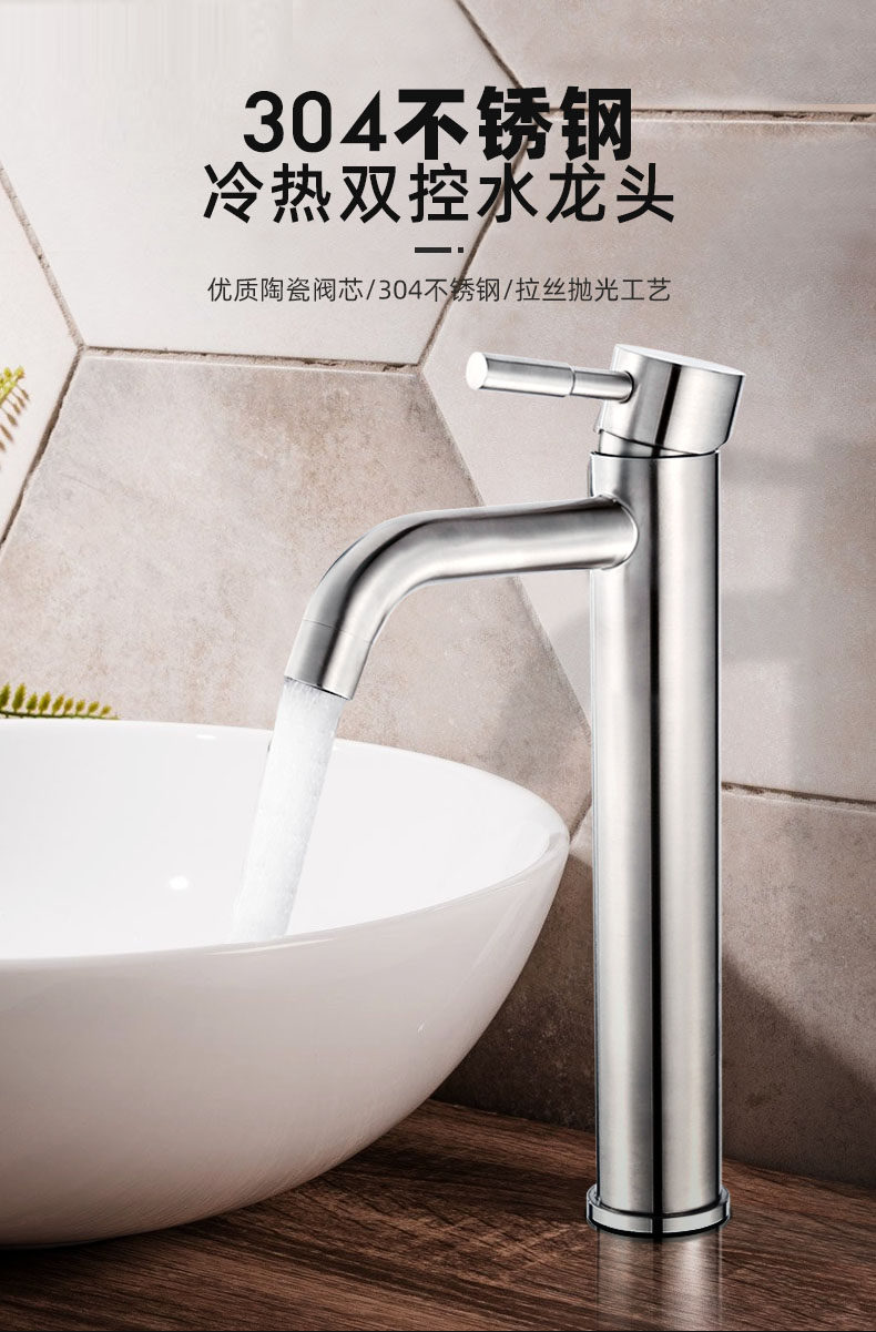 304 Stainless Steel Faucet for Home Bathroom Sink, Washbasin, Hot and Cold, Elevated Single Cold Basin Faucet