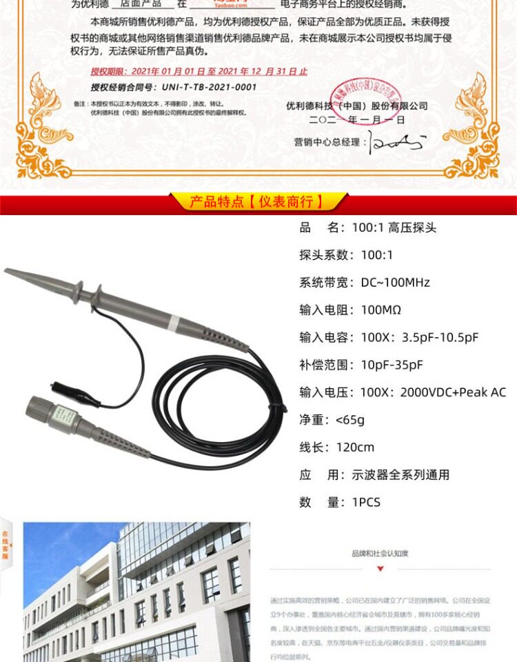 Uni-T Ut-P12 Universal 100Mhz Passive High Voltage Oscilloscope Test Probe 100:1 Probe 2000V Test