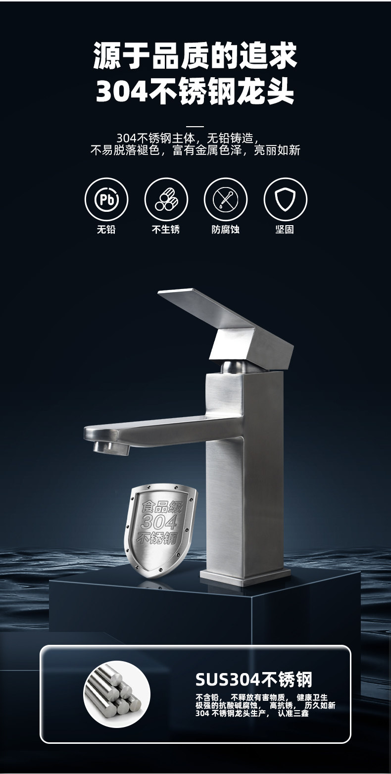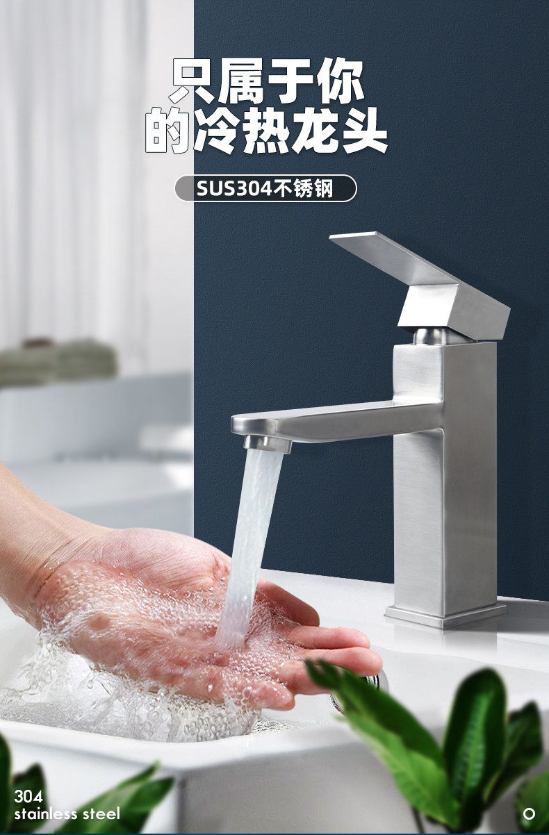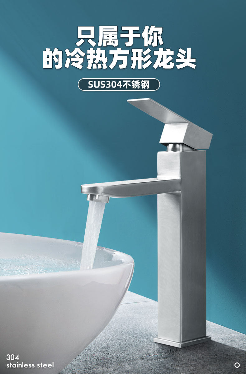 304 Stainless Steel Hot and Cold Square Basin Faucet for Home Use, Bathroom Washbasin, Single Hole, Single Cold, Tall Model