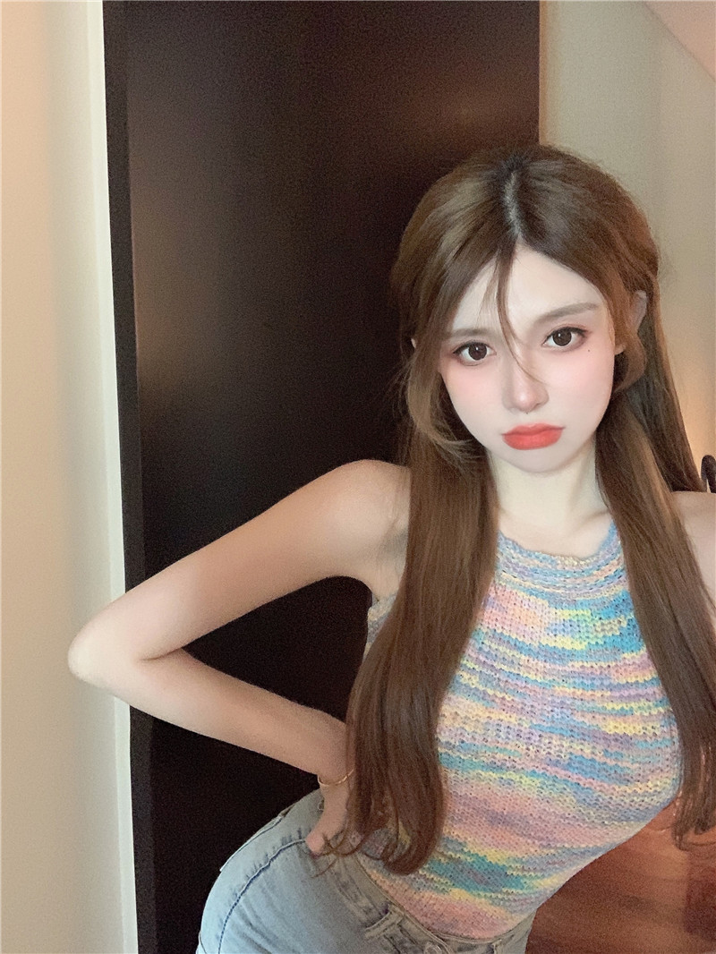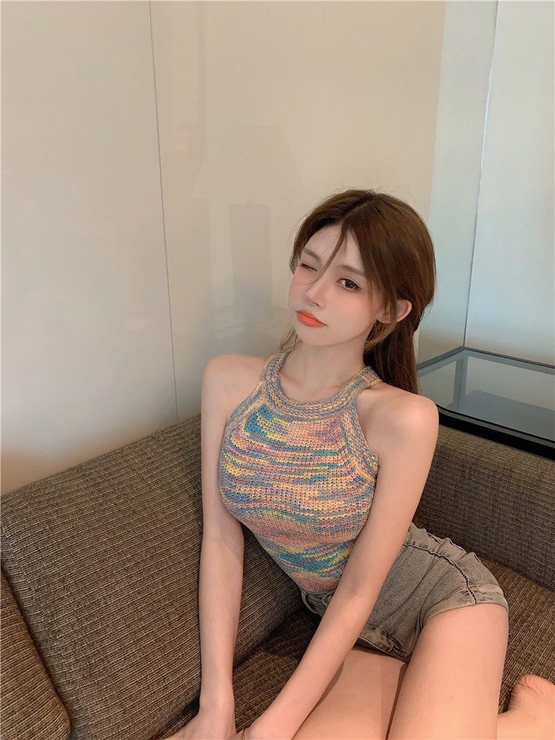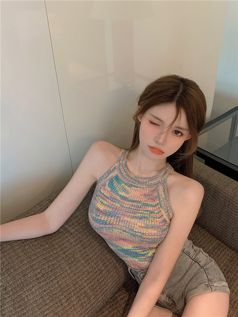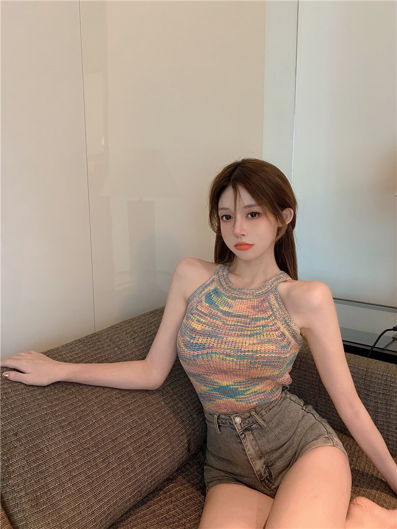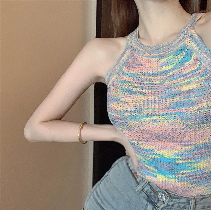Sleeveless Knitted Rainbow Camisole for Women, Summer Fashion, Versatile, Slimming, Stylish, Halter Neck, Off-Shoulder Top