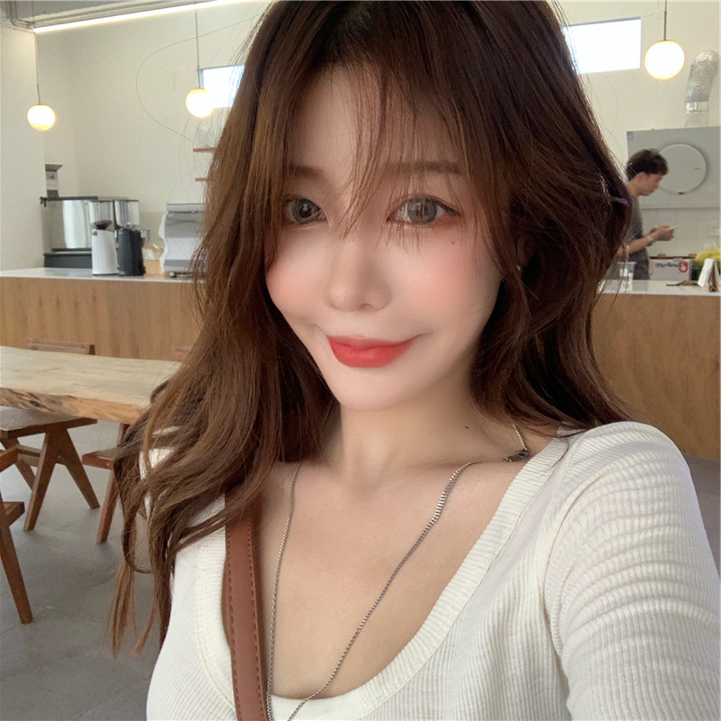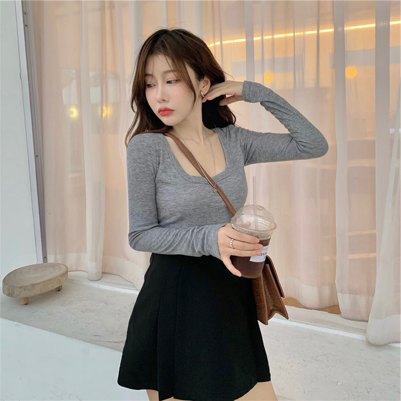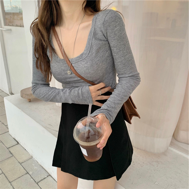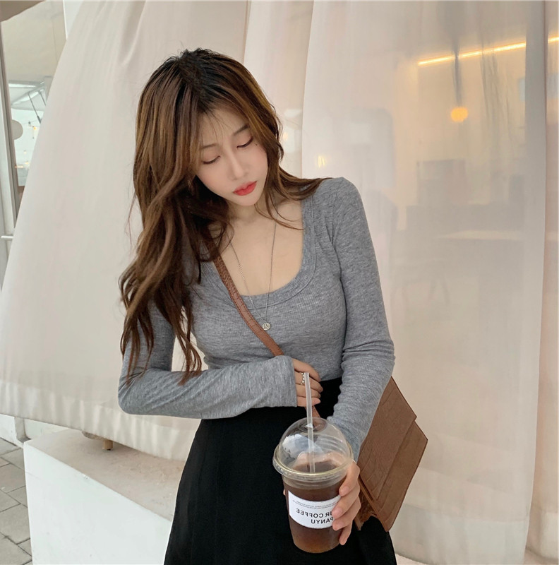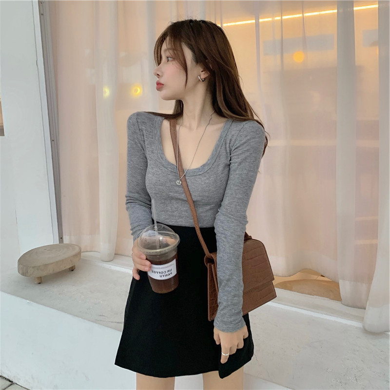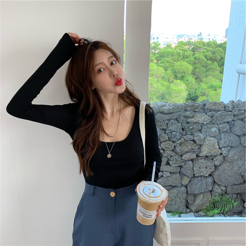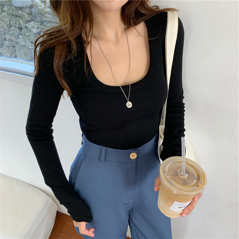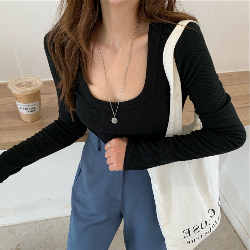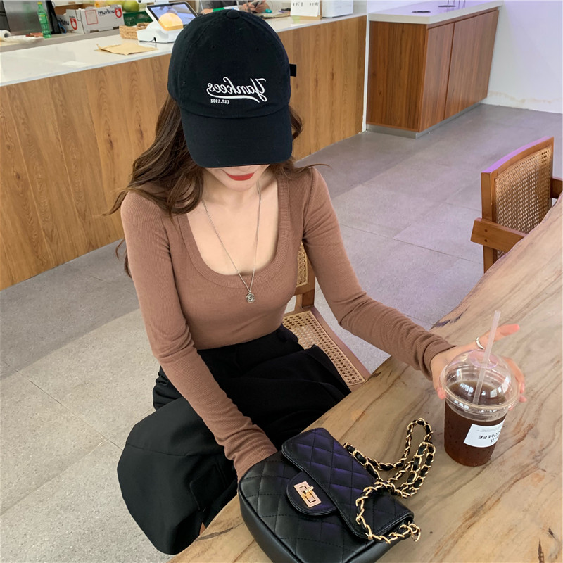 Autumn and Winter Thin Fleece Brushed Large U-Neck Solid Color Long-Sleeve T-Shirt for Women, Suitable for Layering or Wearing Alone