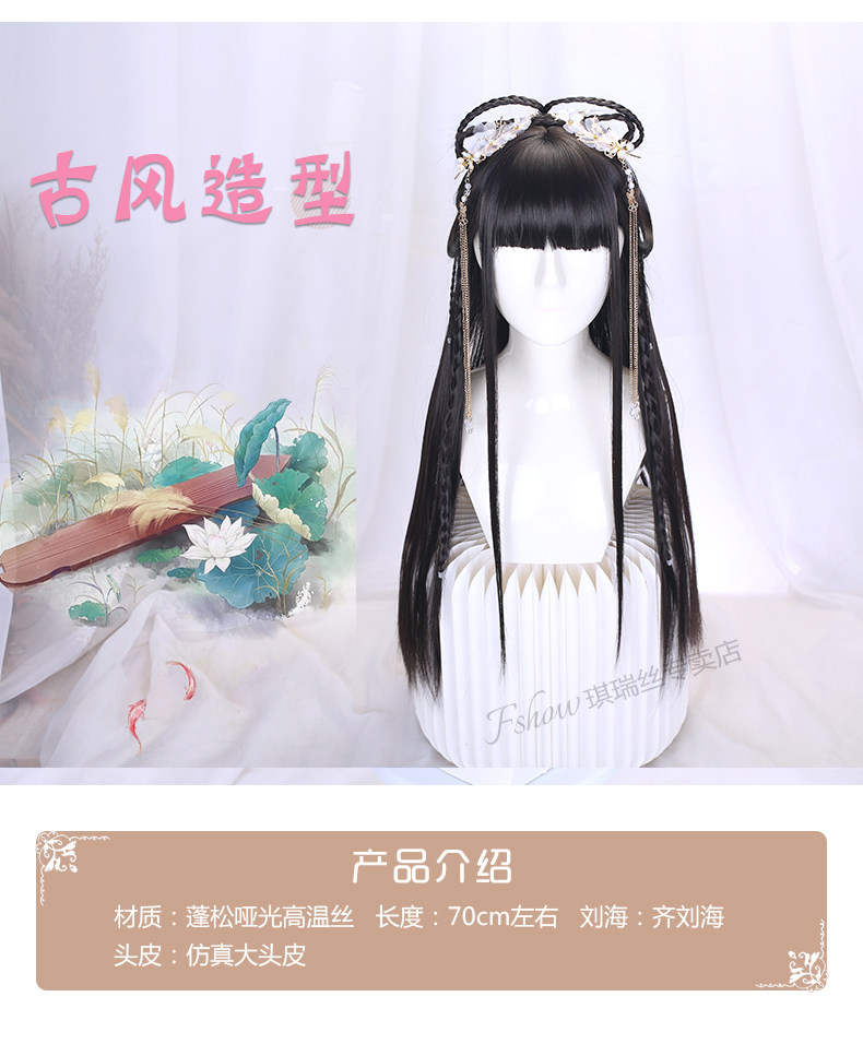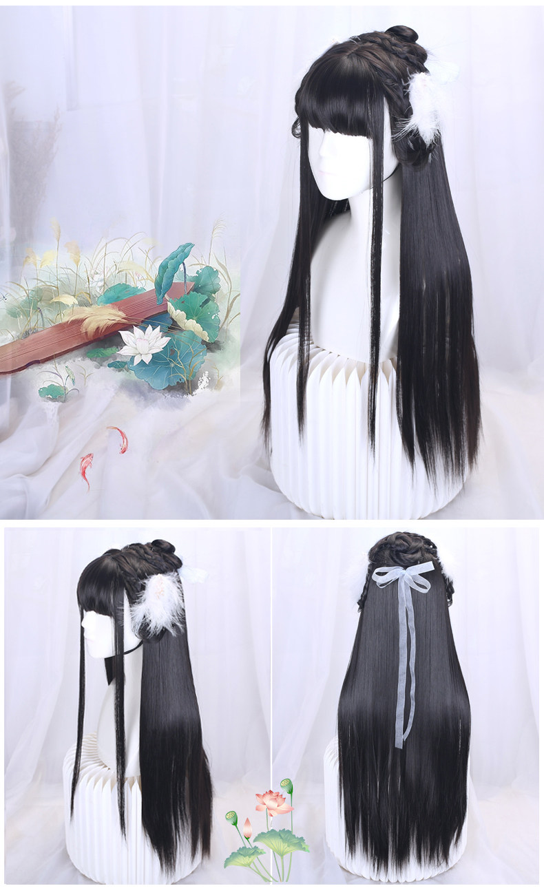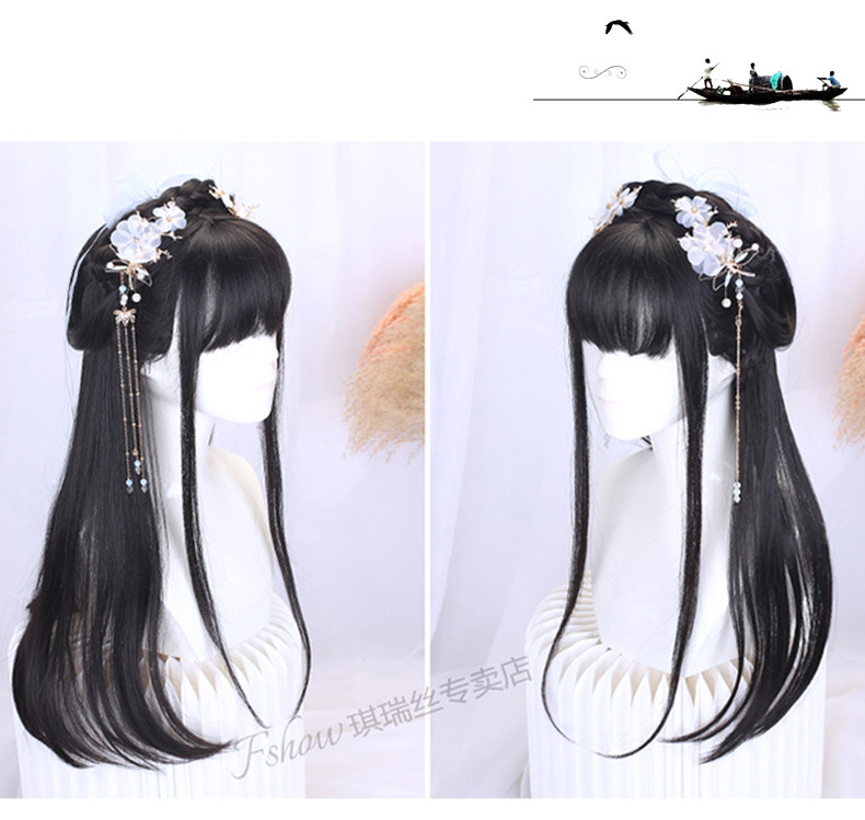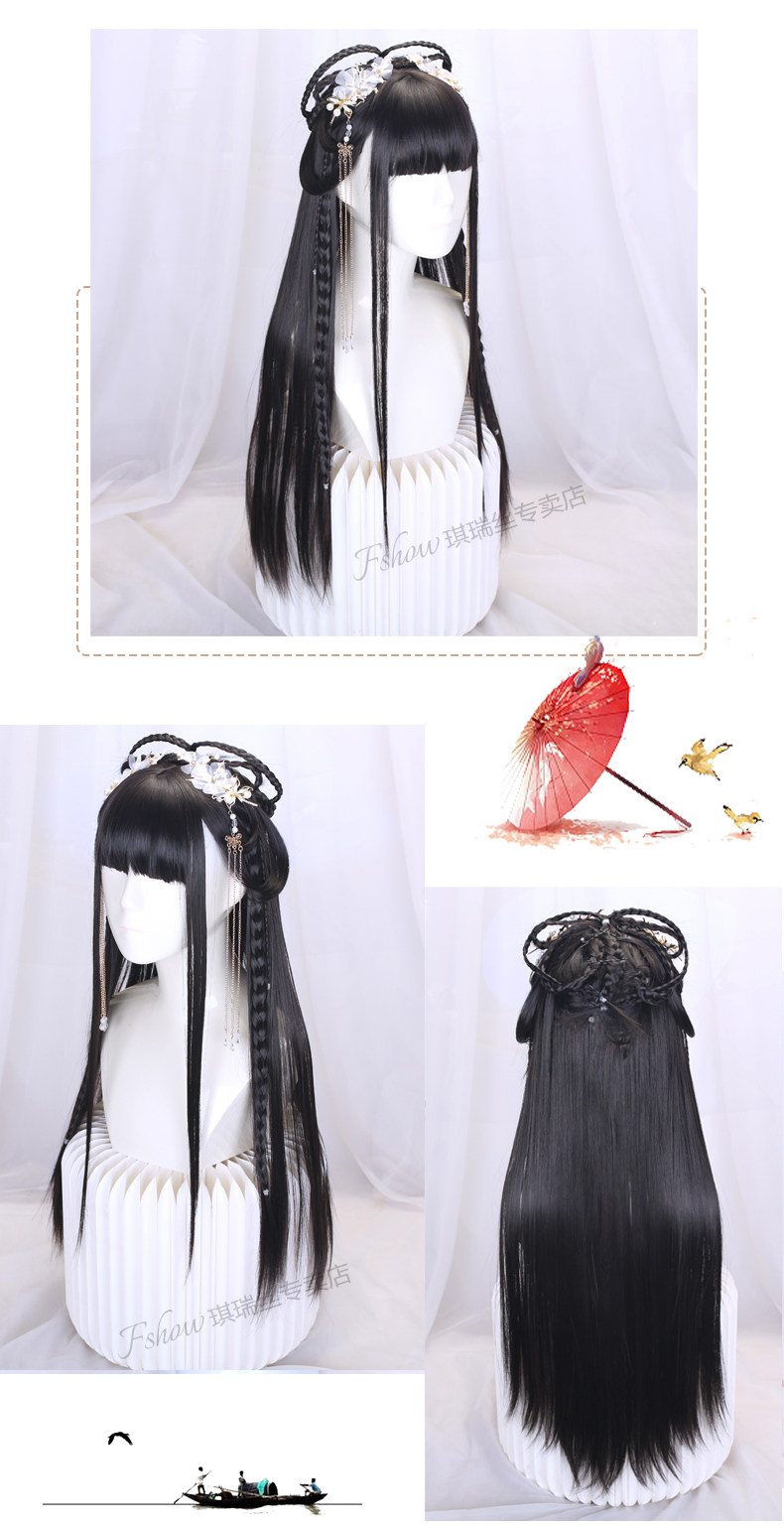 Hanfu Wig with Integrated Headband for Round Face, Natural Ancient Costume Wig for Women, Long Hair, Full Head Wig with Bangs