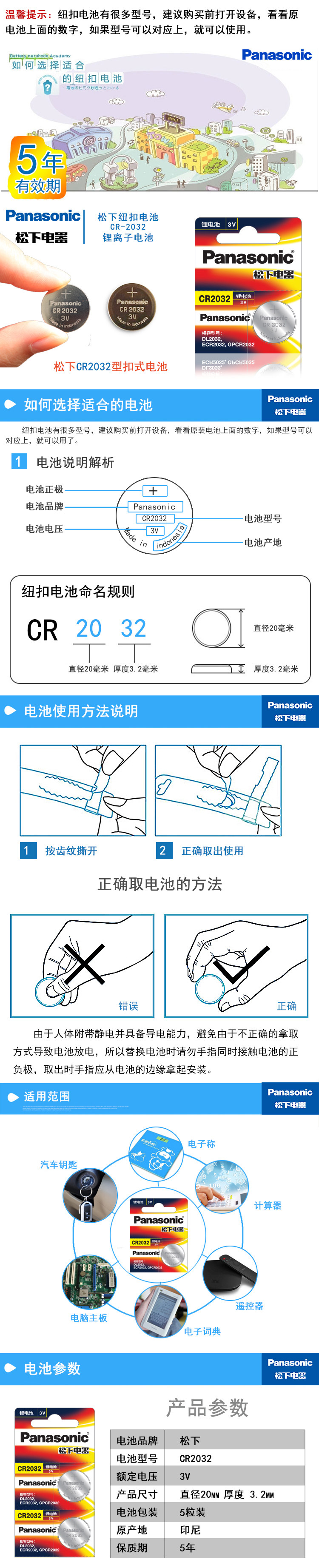 Panasonic Genuine Original Imported Button Battery Cr2032 for Car Key Remote Control, Computer Motherboard, Electronic Scale, Weight Scale, Watch, Camera, Calculator, Game Controller, Set-Top Box, 5 Pieces, 3V