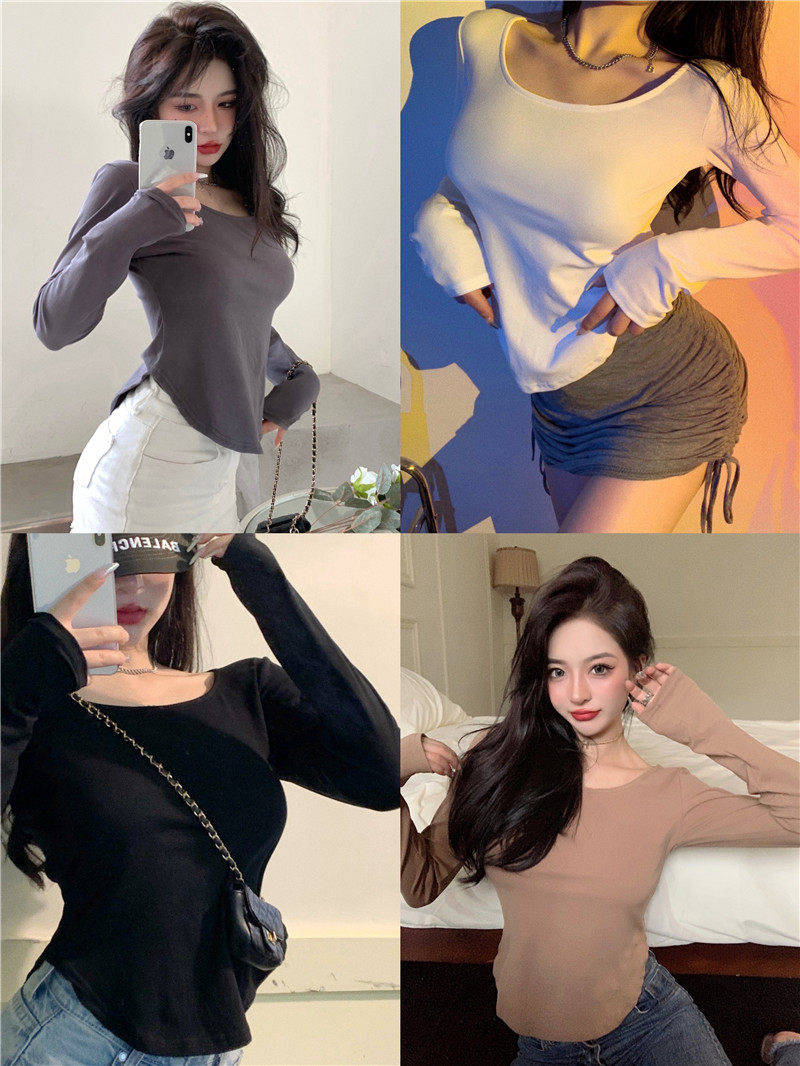 Pure Desire Style U-Neck Gray Long-Sleeve T-Shirt for Women 2023 Early Autumn New Slim-Fit Irregular Curved Hem Base Top