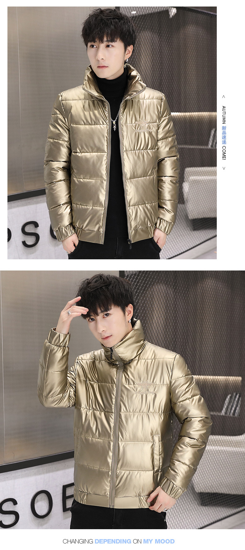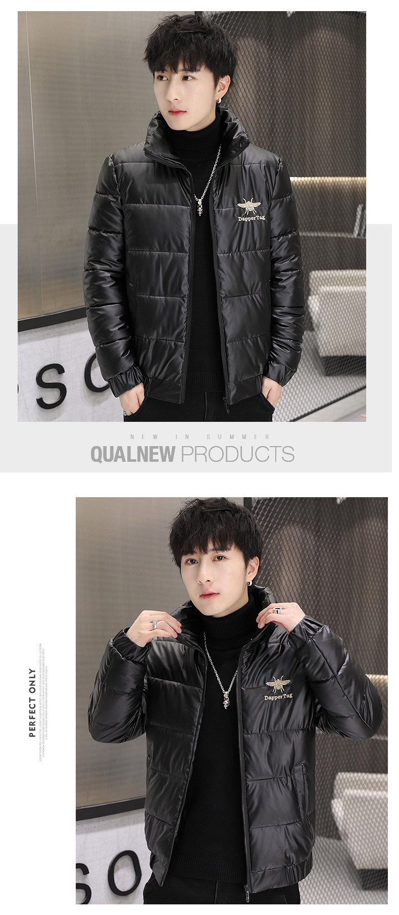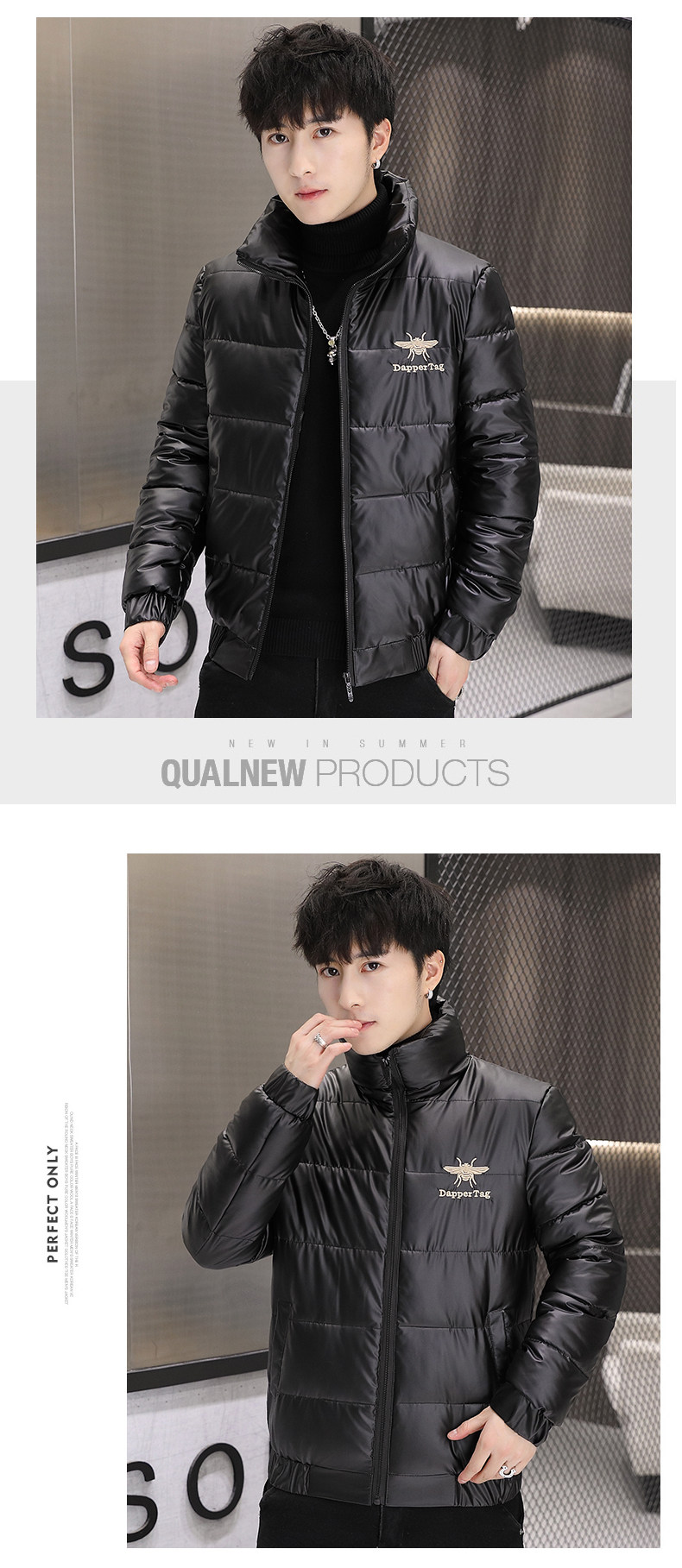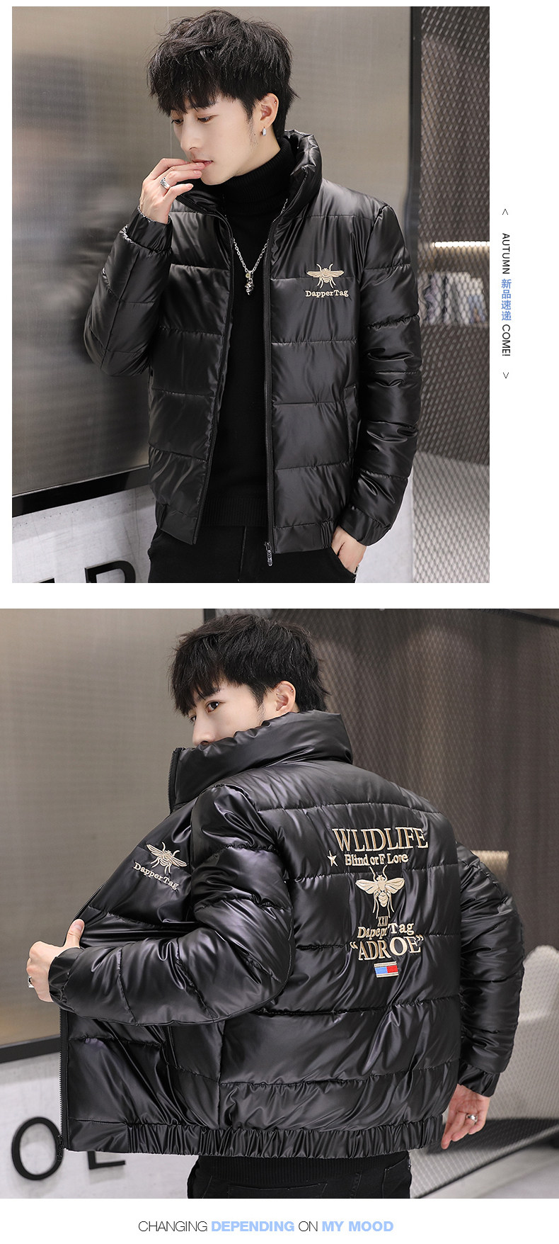 New Men's Cotton Coat with Shiny Leather, Winter Jacket, Trendy Stand-Up Collar, Waterproof, Thick, Short down Cotton Jacket, Youth Cotton-Padded Jacket