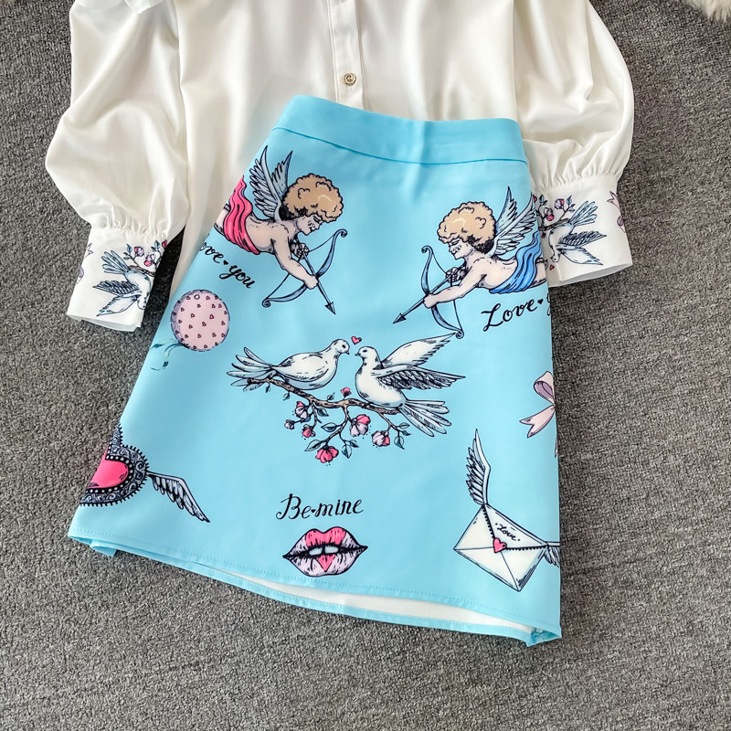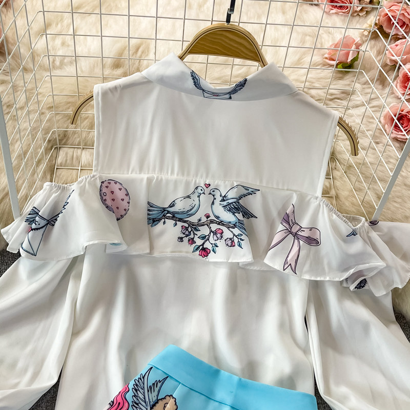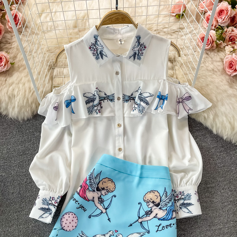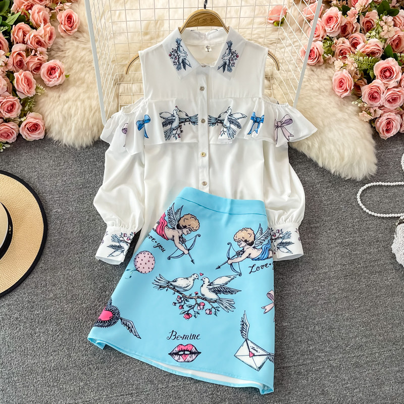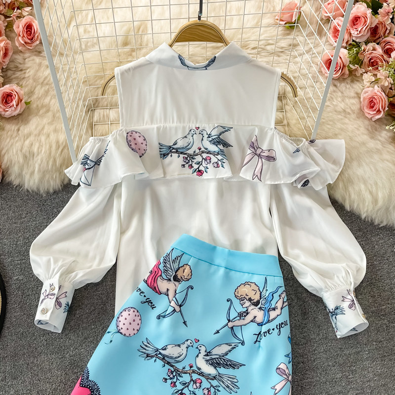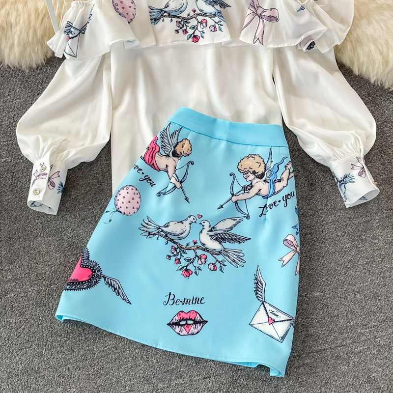 Fashion Suit for Women, Spring and Autumn New Style, European and American High-End Long-Sleeved Off-Shoulder Shirt Two-Piece Set, High-Waisted Hip-Hugging Skirt