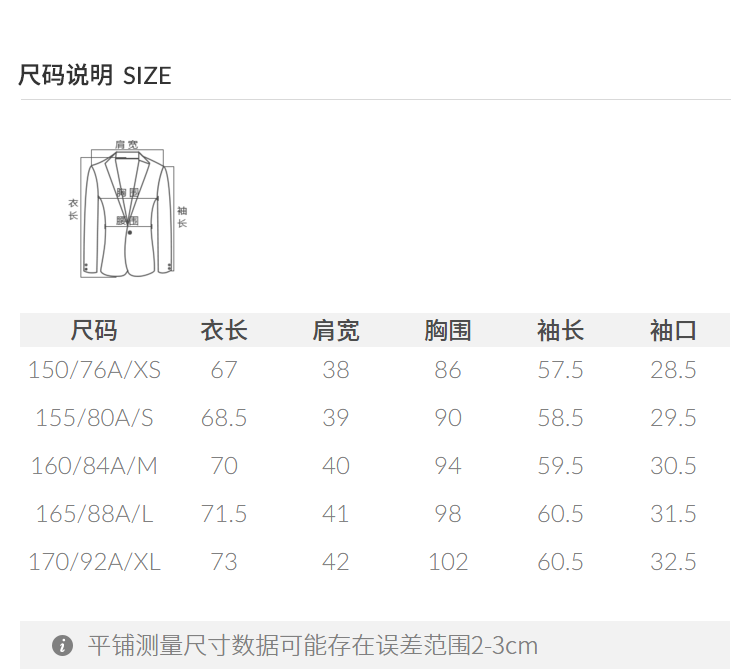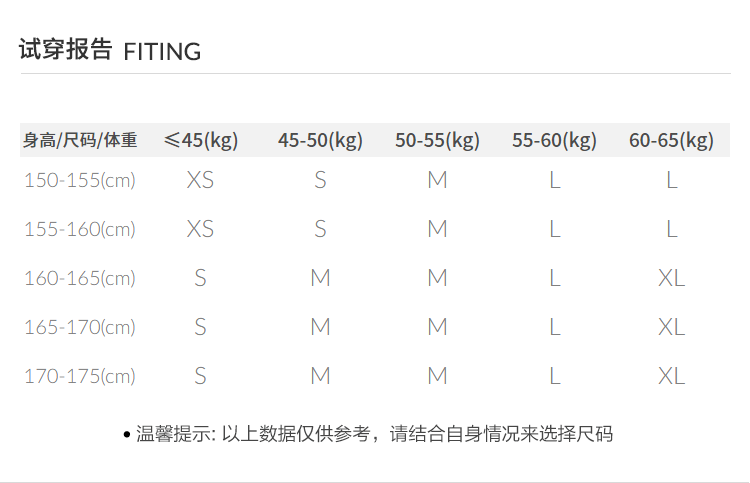 China (cm) 160-165/84-86 165-170 / 88-90 167-172 / 92-96 168-173 / 98-102 170-176 / 106-110