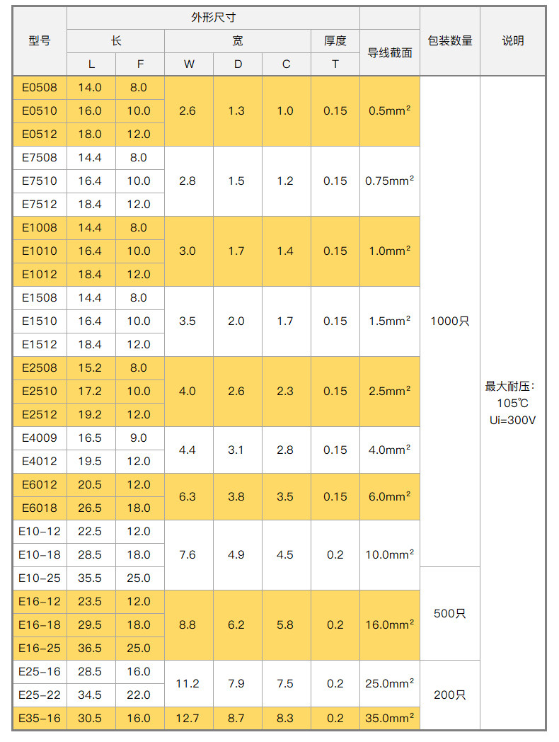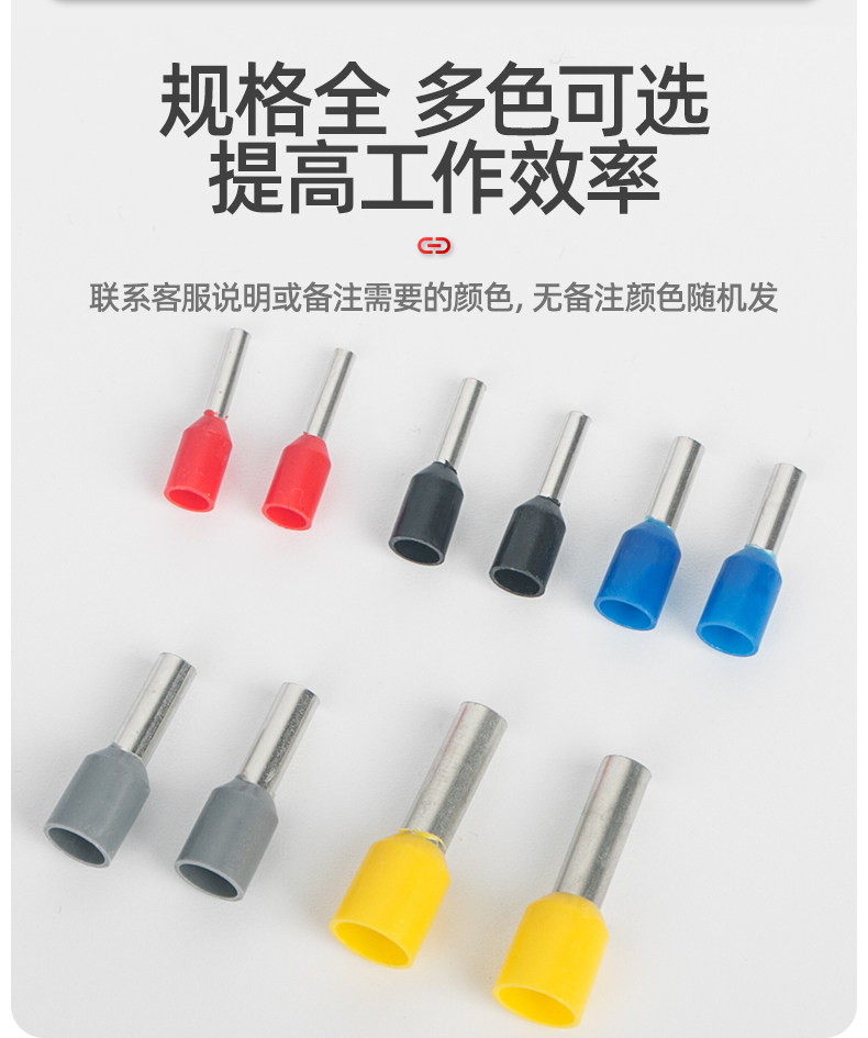 Color Classification E0506 (100 Pieces of Brass),E0508 (100 Pieces of Brass),E0510 (100 Pieces of Brass),E0512 (100 Pieces of Brass),E7508 (Brass 100 Pieces),E7510 (100 Pieces of Brass),E7512 (100 Pieces of Brass),E1008 (100 Pieces of Brass),E1010 (100 Pieces of Brass),E1012 (100 Pieces of Brass),E1508 (100 Pieces of Brass),E1510 (100 Pieces of Brass),E1512 (100 Pieces of Brass),E1518 (100 Pieces of Brass),E2508 (100 Pieces of Brass),E2510 (100 Pieces of Brass),E2512 (100 Pieces of Brass),E2518 (100 Pieces of Brass),E4009 (100 Pieces of Brass),E4012 (100 Pieces of Brass),E4018 (100 Pieces of Brass),E6012 (100 Pieces of Brass),E6018 (100 Pieces of Brass),E10-12 (100 Pieces of Brass),E10-18 (100 Pieces of Brass),E10-25 (50 Pieces of Brass),E16-12 (50 Pieces of Brass),E16-18 (50 Pieces of Brass),E16-25 (50 Pieces of Brass),E25-16 (20 Pieces of Brass),E25-18 (20 Pieces of Brass),E25-22 (20 Pieces of Brass),E25-25 (20 Pieces of Brass),E35-16 (20 Pieces of Brass),E35-18 (20 Pieces of Brass),E35-25 (20 Pieces of Brass),E0308 (100 Pieces of Copper),E0310 (100 Pieces of Copper),E0506 (100 Pieces of Copper),E0508 (100 Pieces of Copper),E0510 (100 Pieces of Copper),E0512 (100 Pieces of Copper),E7508 (100 Pieces of Copper),E7510 (100 Pieces of Copper),E7512 (100 Pieces of Copper),E1008 (100 Pieces of Copper),E1010 (100 Pieces of Copper),E1012 (100 Pieces of Copper),E1508 (100 Pieces of Copper),1510 (100 Pieces of Copper),E1512 (100 Pieces of Copper),E1518 (100 Pieces of Copper),E2508 (100 Pieces of Copper),E2510 (100 Pieces of Copper),E2512 (100 Pieces of Copper),E2518 (100 Pieces of Copper),E4009 (100 Pieces of Copper),E4012 (100 Pieces of Copper),E4018 (100 Pieces of Copper),E6012 (100 Pieces of Copper),E6018 (100 Pieces of Copper),E10-12 (100 Pieces of Copper),E10-18 (100 Pieces of Copper),E16-12 (50 Pieces of Copper),E16-18 (50 Pieces of Copper),E25-16 (20 Pieces of Copper),E35-16 (20 Pieces of Copper,Hsc8 6-4A (Red and Black)