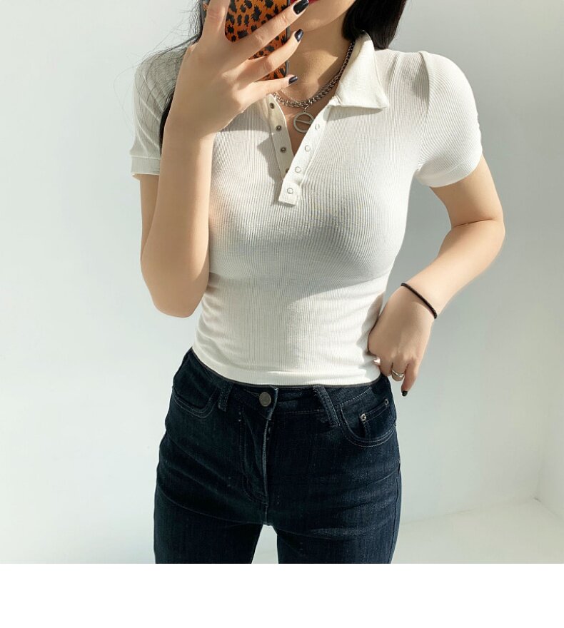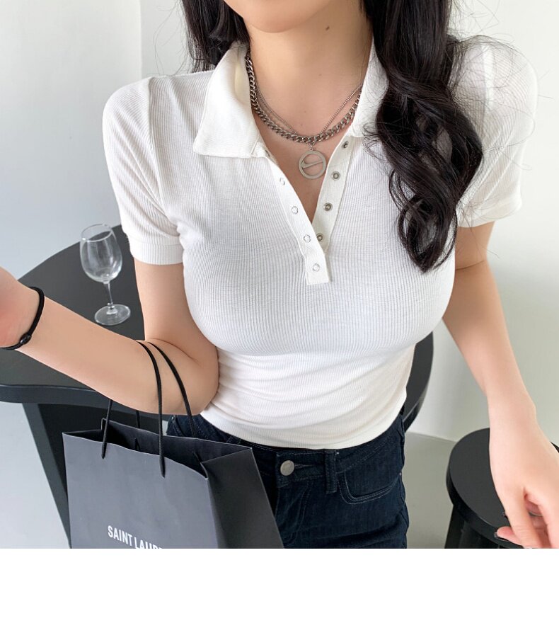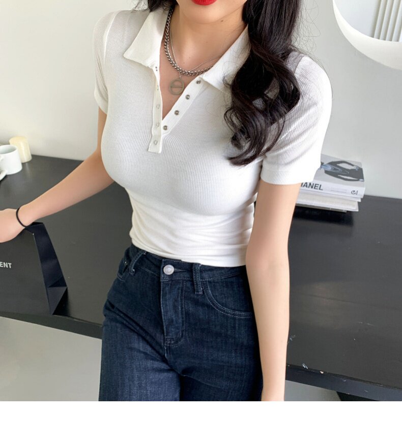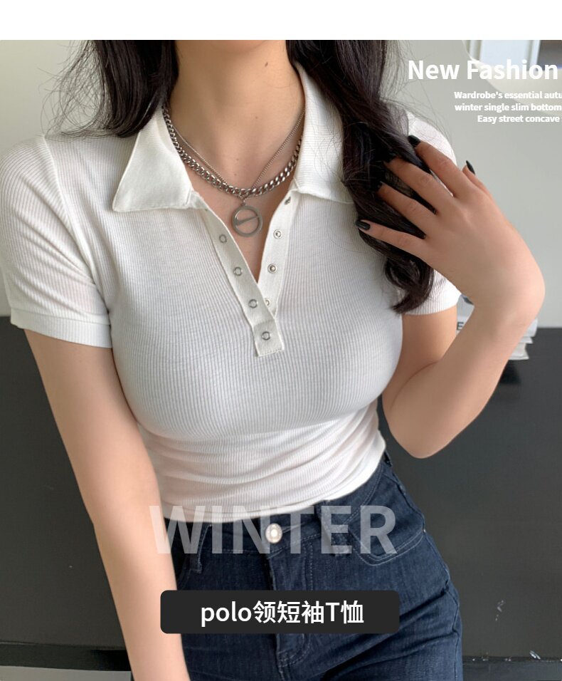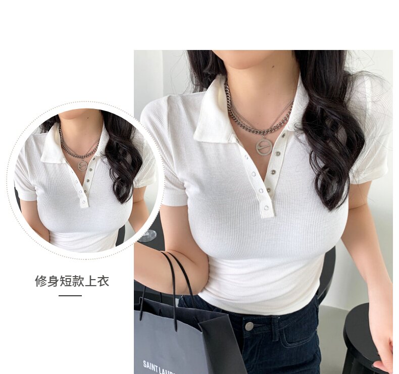 European Style Polo Collar Hidden Button White Short-Sleeve T-Shirt for Women, 2025 Summer New Base Layer Top, Short Style