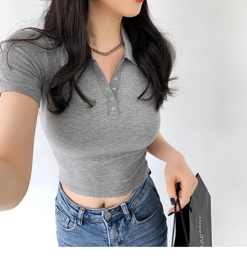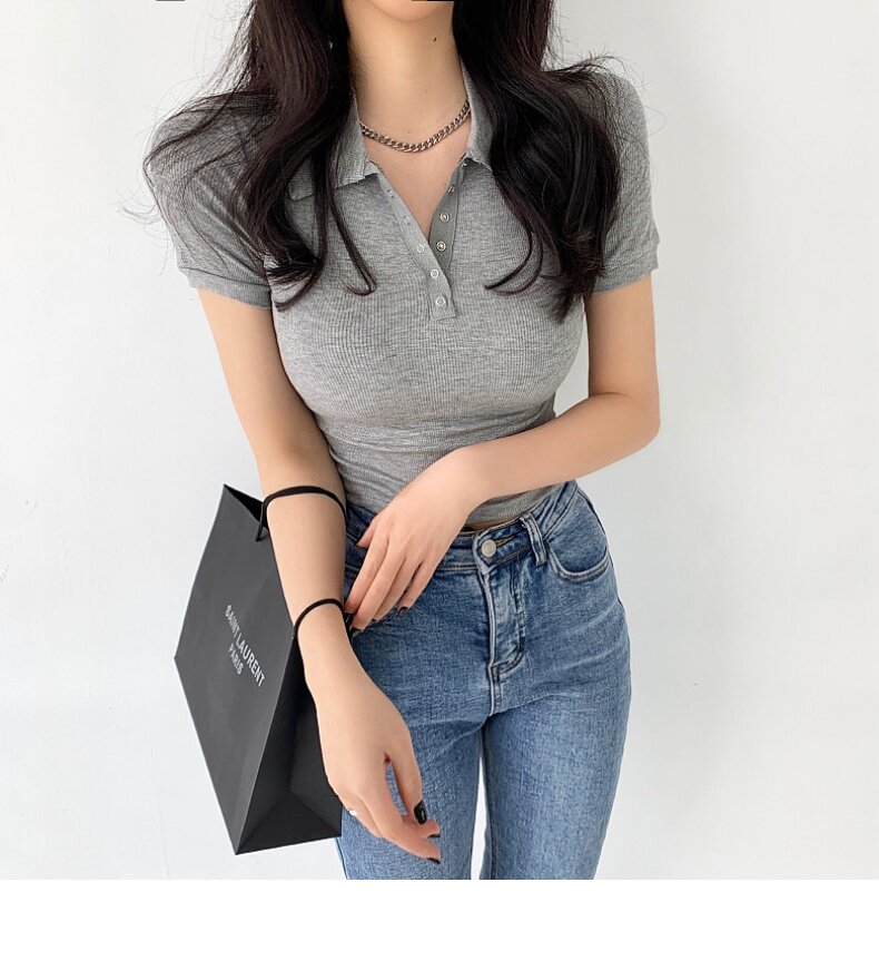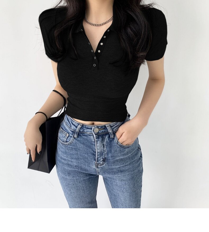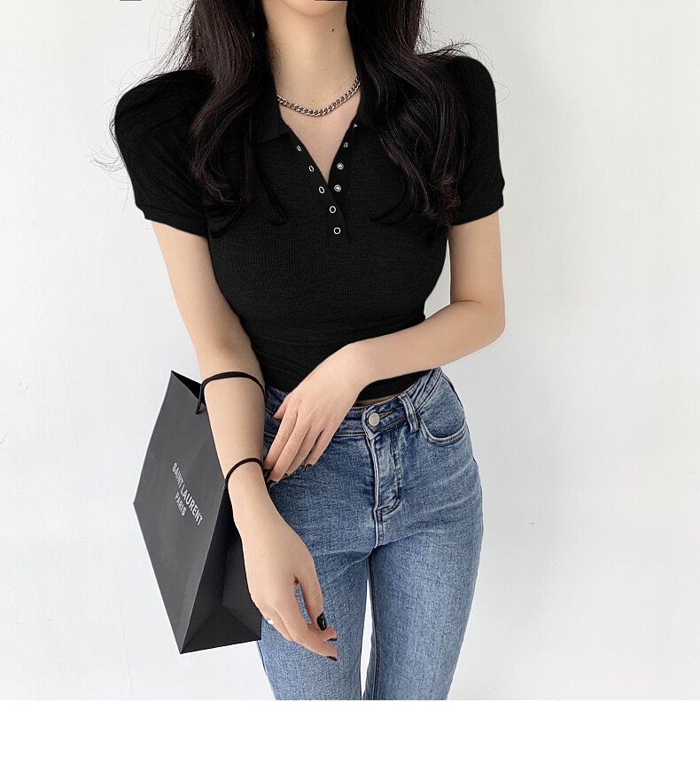 European Style Polo Collar Hidden Button White Short-Sleeve T-Shirt for Women, 2025 Summer New Base Layer Top, Short Style