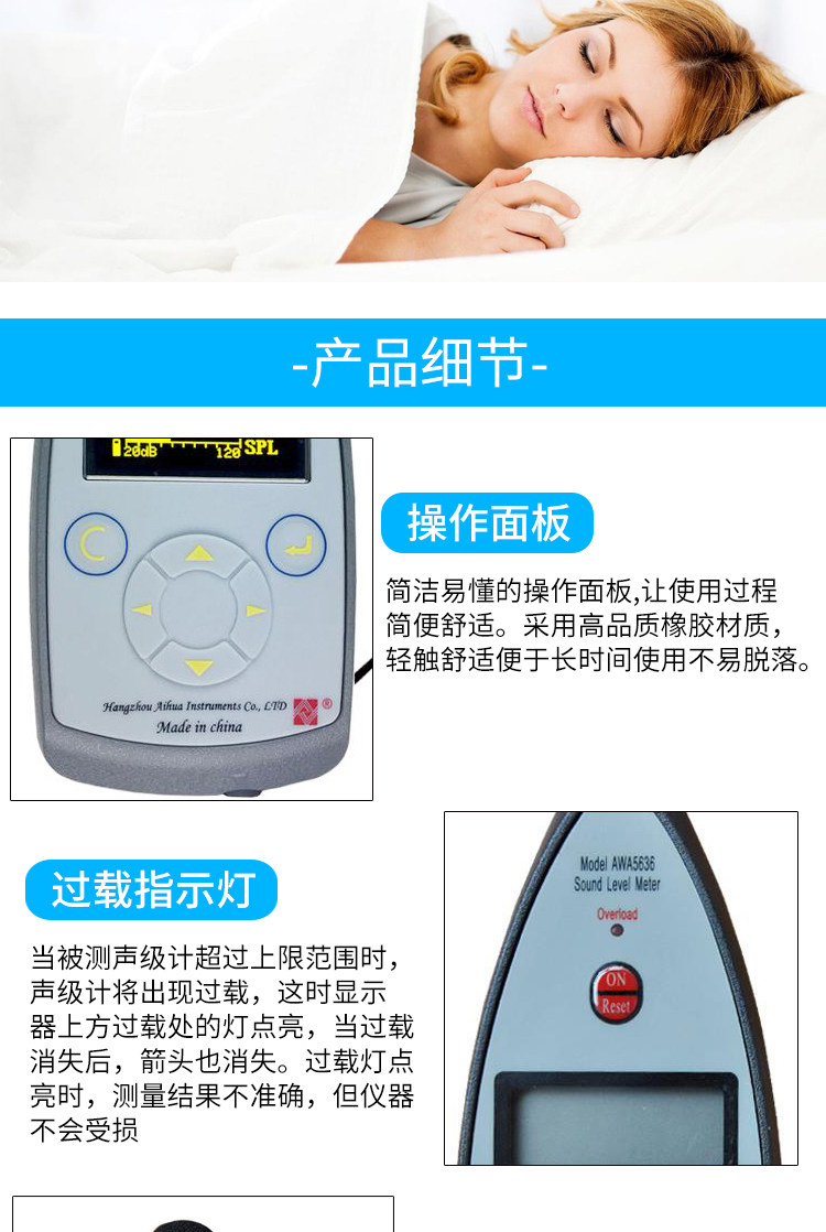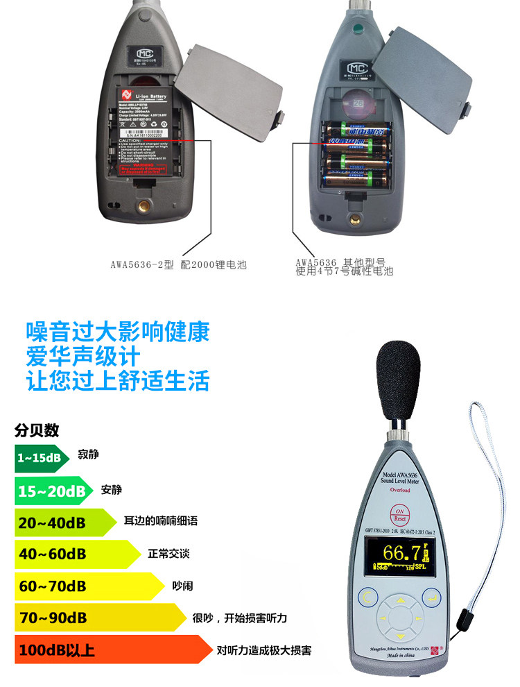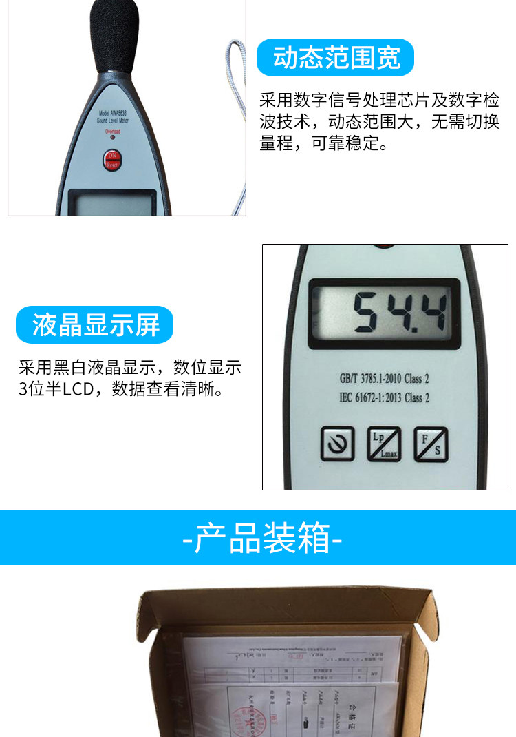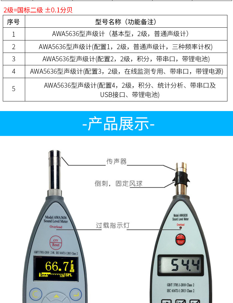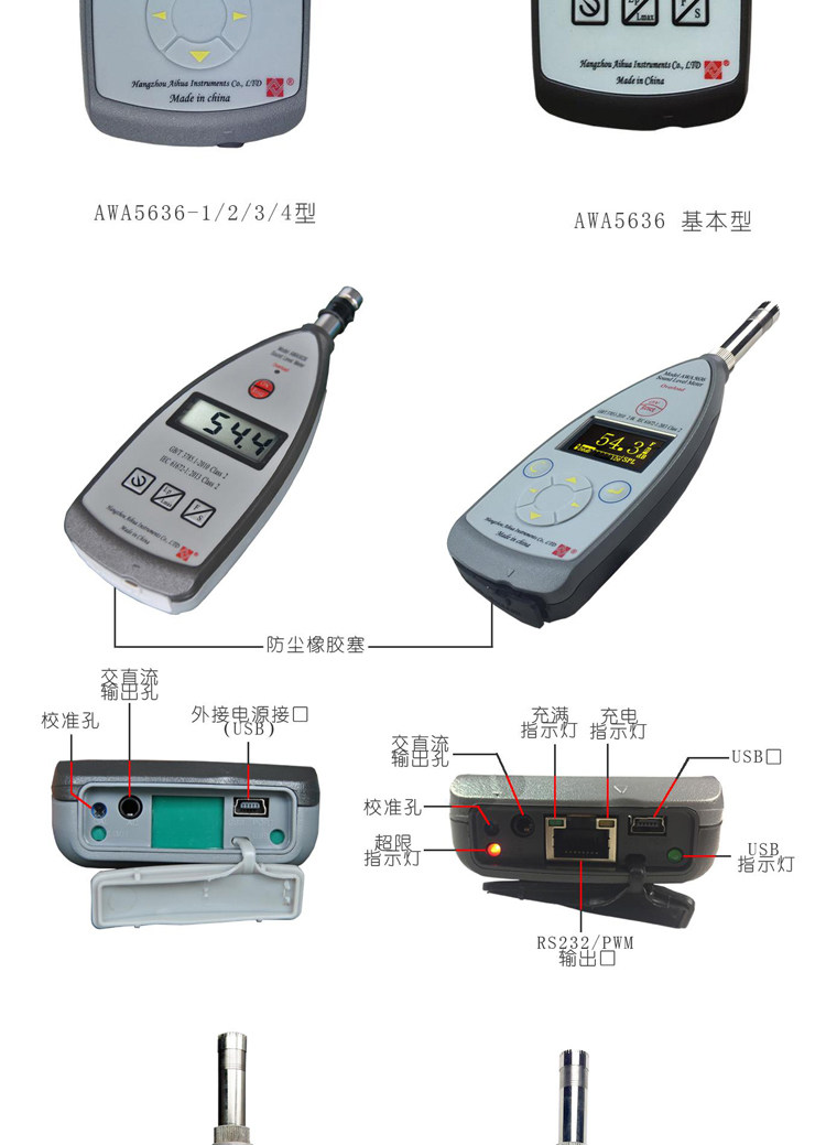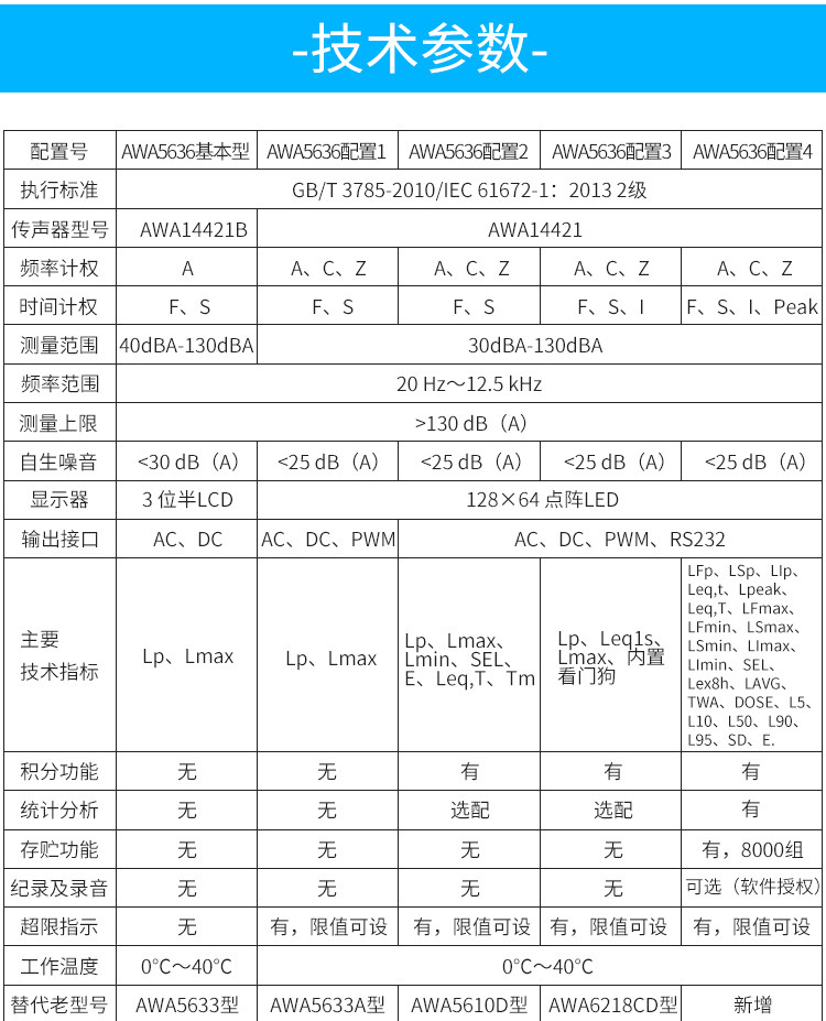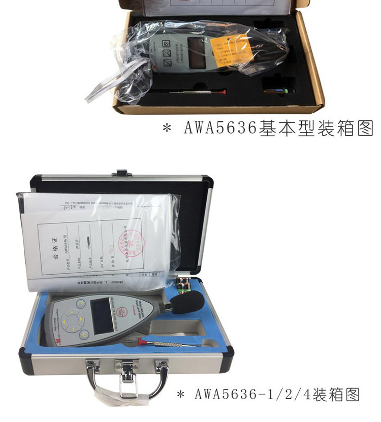 Color Classification Awa5636 (Basic Type, Level 2, Standard Sound Level Meter),Awa5636 (Configuration 1, Level 2, Standard Sound Level Meter, Three Frequency Weightings),Awa5636 (Configuration 2, Level 2, Points, with Serial Port),Awa5636 (Configuration 3, Level 2, Dedicated for Online Monitoring, with Serial Port, with Power Supply),Awa5636 (Configuration 4, Level 2, Score, Statistical Analysis, with Serial Port and USB Interface),Awa6022A Type Sound Calibrator Level 2