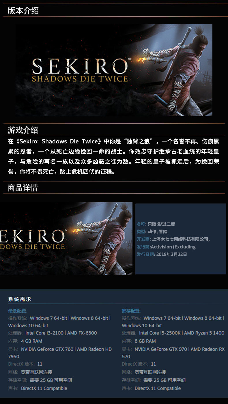 Pc Chinese Steam Game Sekiro: Shadows Die Twice Sekiro: Shadows Die Twice Annual Edition China Region Cd Key Activation Code