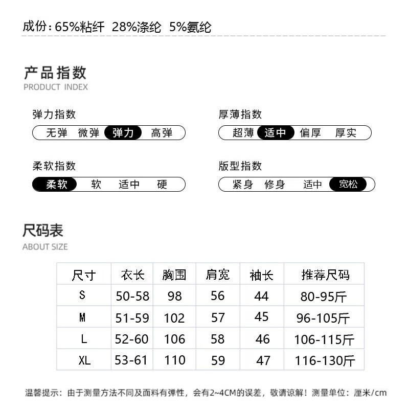 Material Composition Viscose Fiber (Viscose Fiber) 65% Polyethylene Terephthalate (Polyester) 28% Polyurethane Elastic Fiber (Spandex) 7%