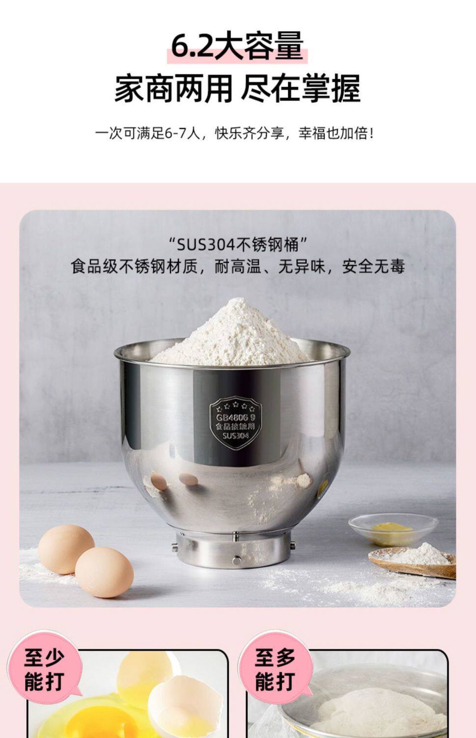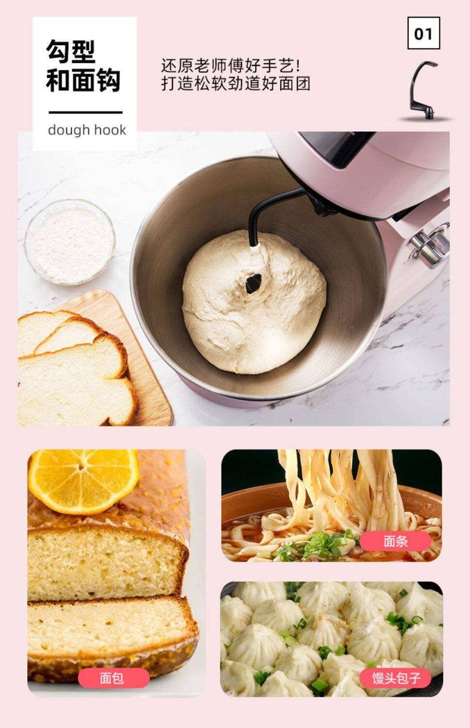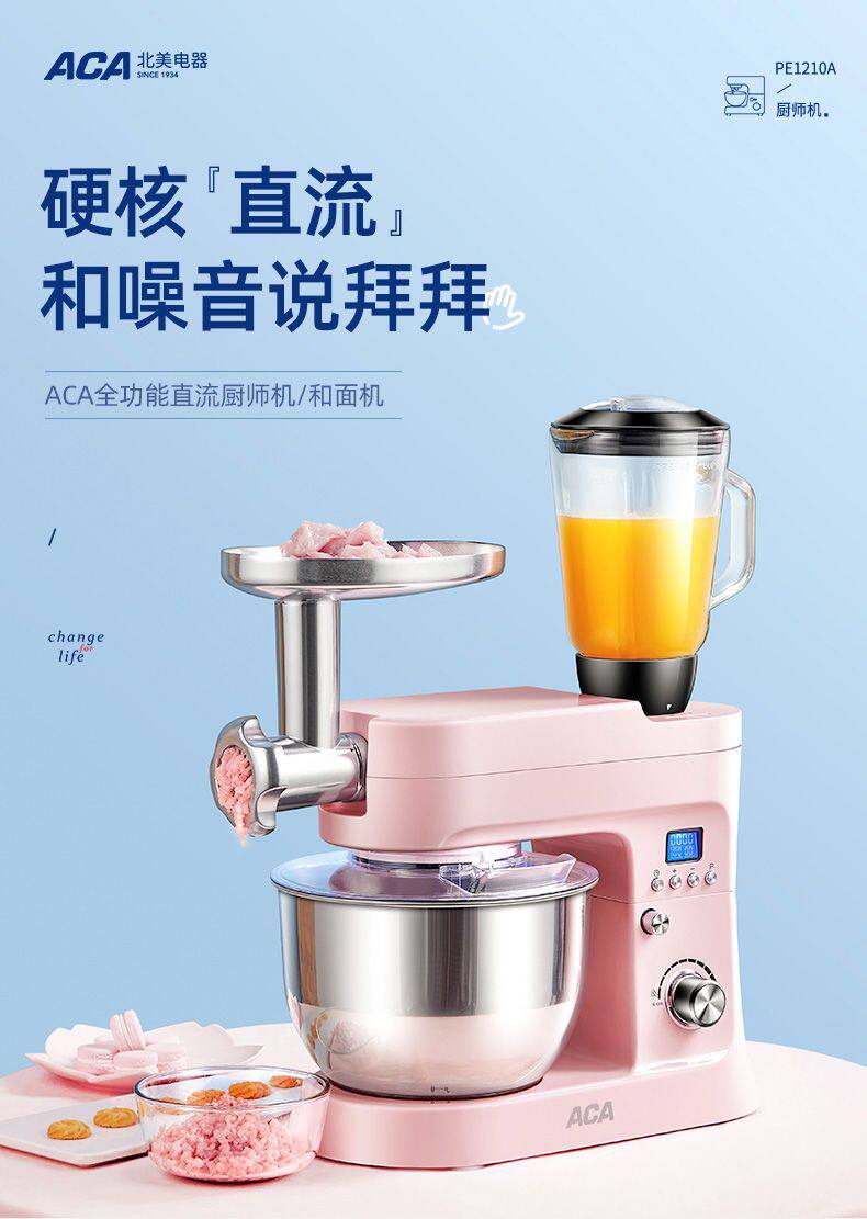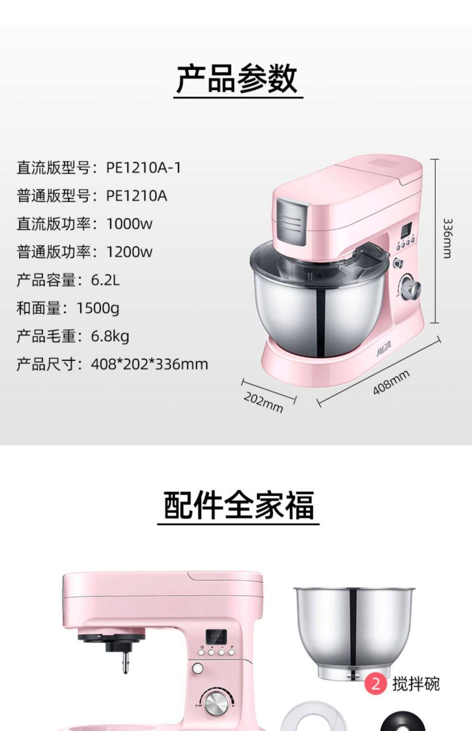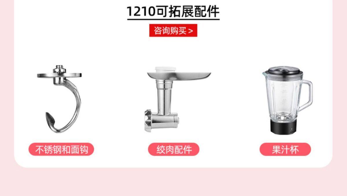 Sort by color Pink DC standard 1000W,Pink DC standard + ground meat enema,Pink DC standard + three-piece noodle making set (plastic interface),Mixing paddle accessories,Egg-beating net accessories,Dough hook accessories,and basin accessories,Pressed leather accessories (plastic interface),Thin surface accessories (plastic interface),Wide accessory (plastic interface),Three-piece noodle making set (plastic interface),304 stainless steel dough hook