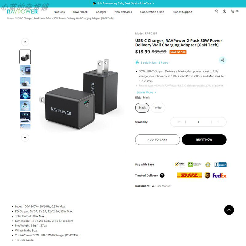 Color Classification Ravpower Gan Pd 30W Pc157 Model - Black, Bulk Packaging (Single Unit),Ravpower Gallium Nitride Pd30 Watt Pc157 Black Box, 2 Pieces in a Box
