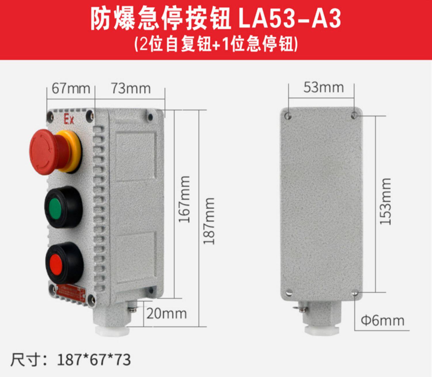 Sort by color La53-A1 (One Twist),La53-A1H (One Twist Emergency Stop),La53-A2 (Two Twists),La53-A3 (Three Twist),La53-A4 (Four Twist),La53-A3H (Three-Twist Emergency Stop),La53-A3D1 (Three Twist with Light),La53-A2D2 (Two Buttons with Light),Emergency Stop,Emergency Stop with Cover,Explosion Proof Button Box