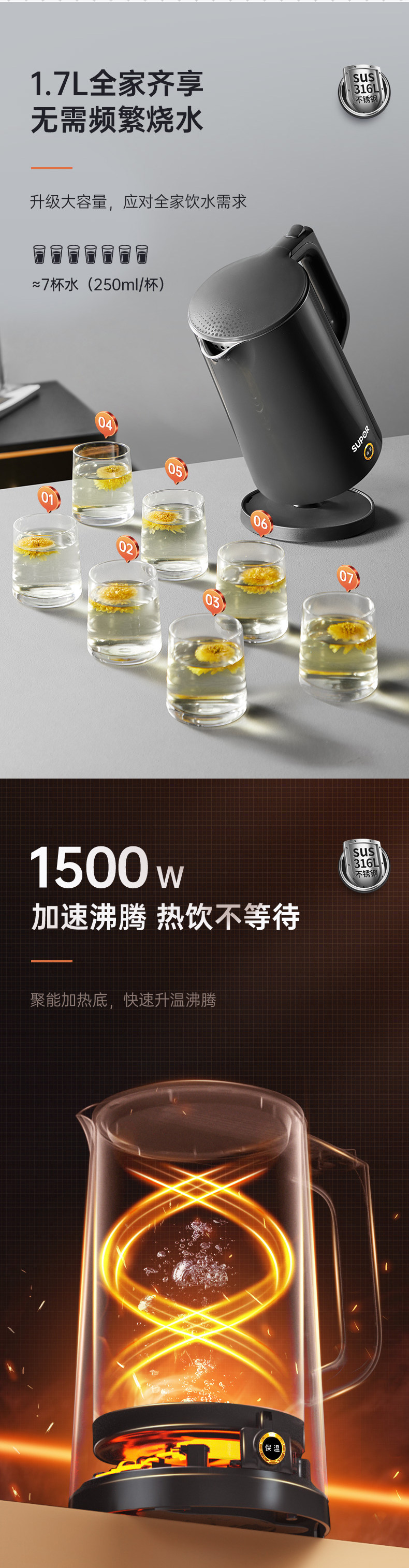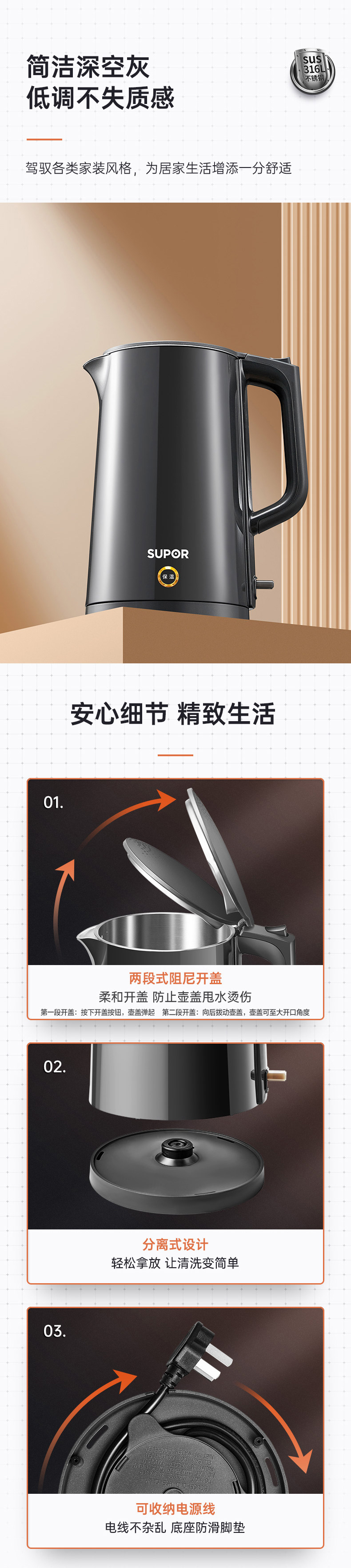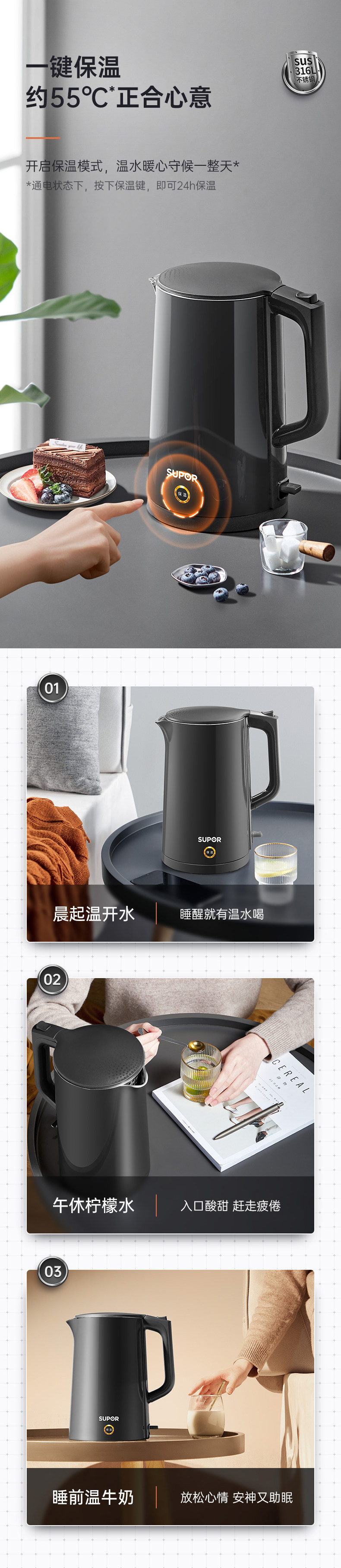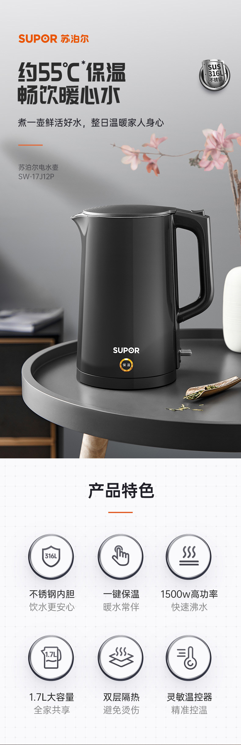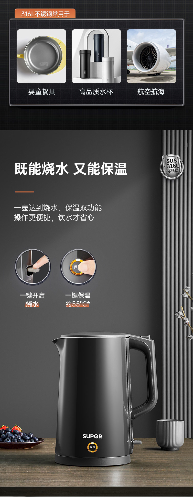 Supor Electric Kettle with Integrated Insulation, 316 Stainless Steel, Intelligent Temperature Control, Automatic Household Kettle