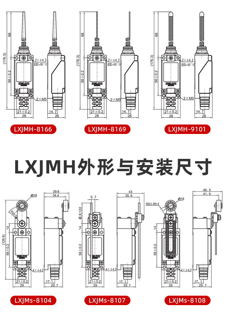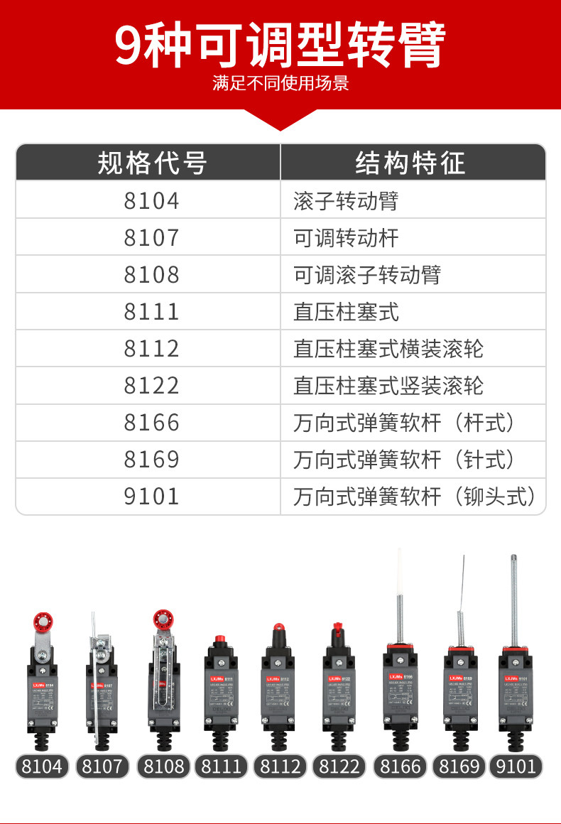Sort by color 8108 Adjustable roller turning lever,8104 roller rotating arm,8107 Adjustable turning lever,8111 direct pressure plunger type,8112 Direct pressure plunger with horizontal roller and roller,8122 Direct pressure plunger with vertical roller,8166 Universal spring soft rod (rod type),8169 Universal spring soft rod (pin type),9101 Universal spring soft rod (rivet head type)