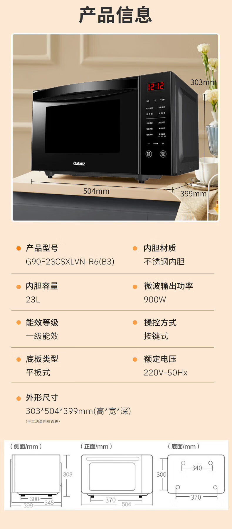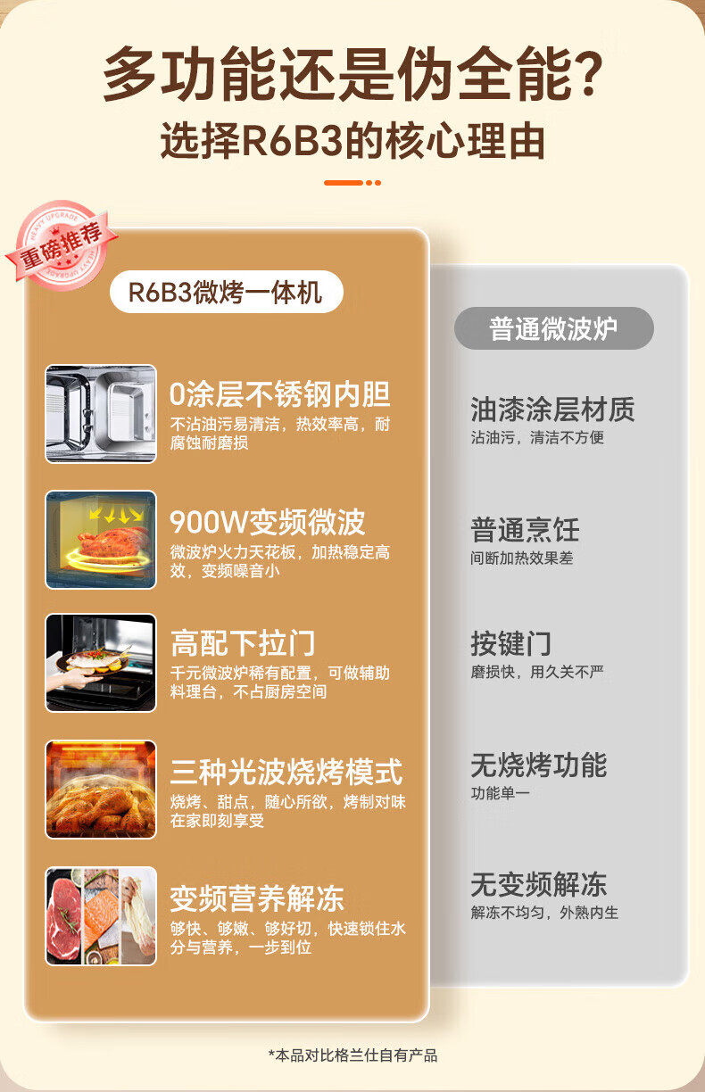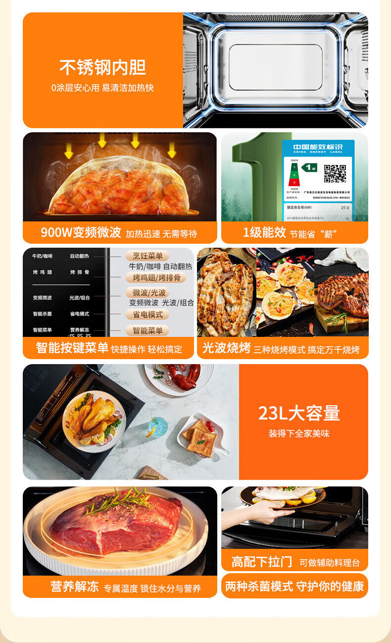 Galanz Household Stainless Steel Microwave Oven 900W Oven Integrated 23-Liter Large Capacity Flat-Panel Light Wave Oven R6B3