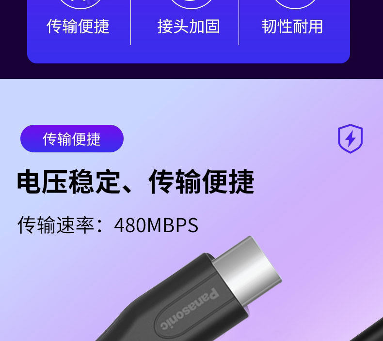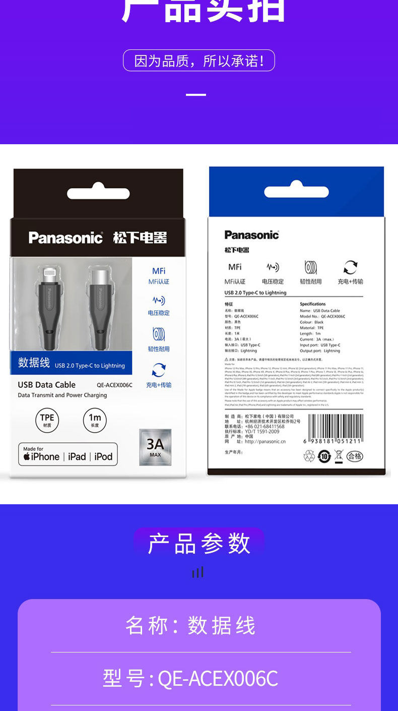 Panasonic Type-C to Lightning Universal Data Cable for Huawei, Xiaomi, Honor, Meizu, Oppo, Oneplus, Vivo, P30, Android Phones, Iphone, iPad Tablets, Mfi Certified Data Cable 1m
