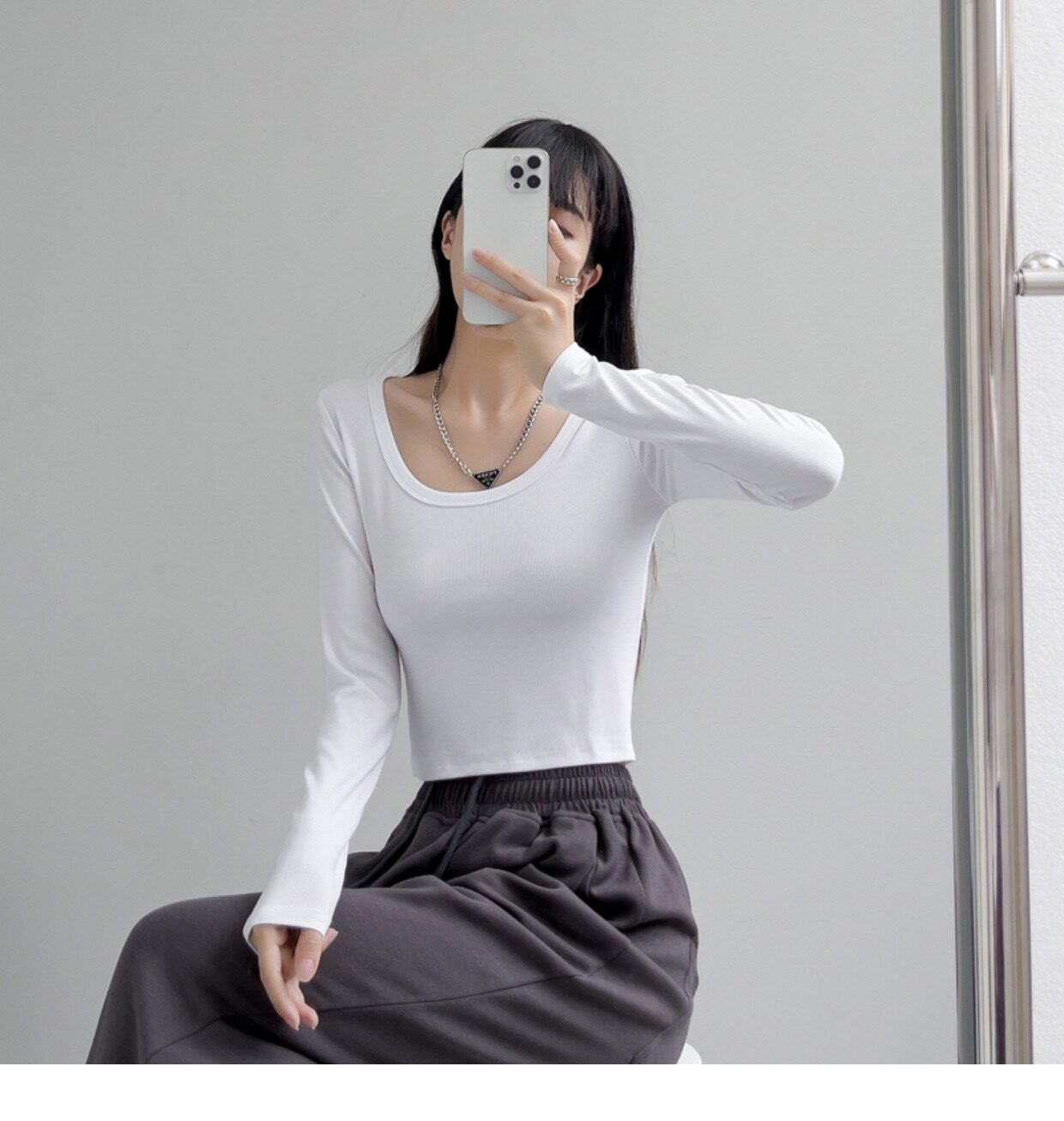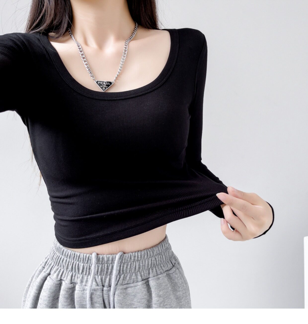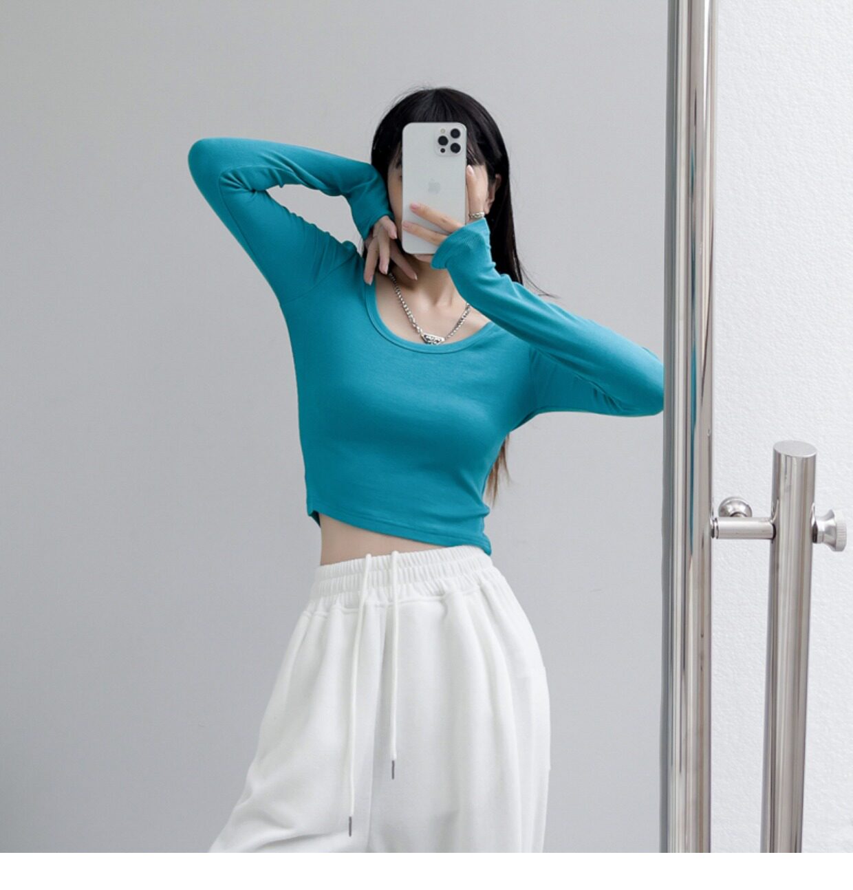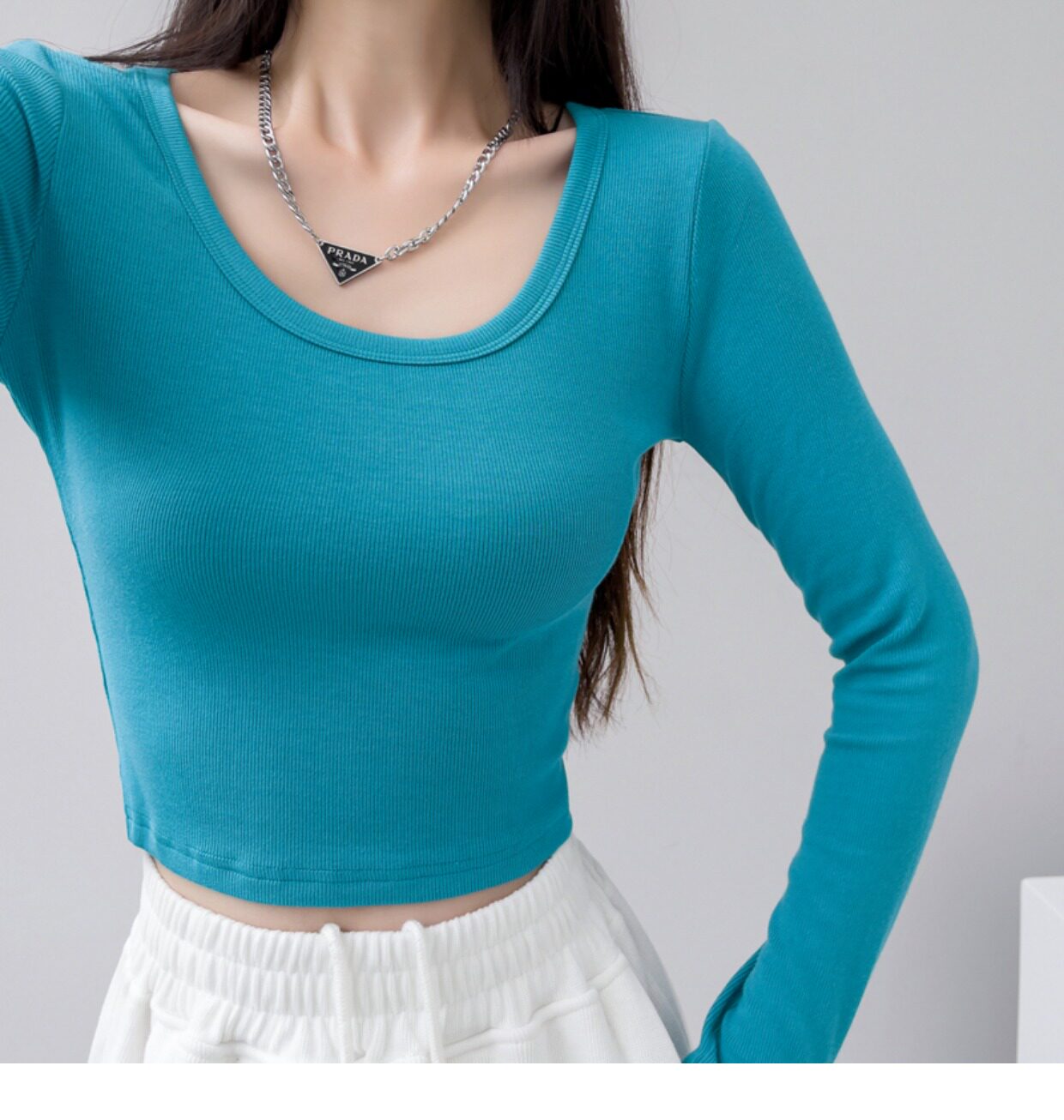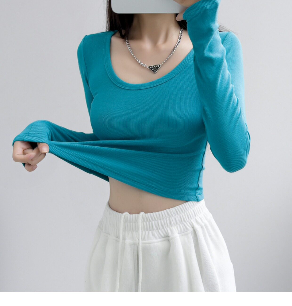 2025 Autumn and Winter Long-Sleeve Tight-Fitting U-Neck Base Shirt in Sky Blue, High-Waisted Short Style, Enhances Bust Appearance, Trendy Inner Wear Top for Women