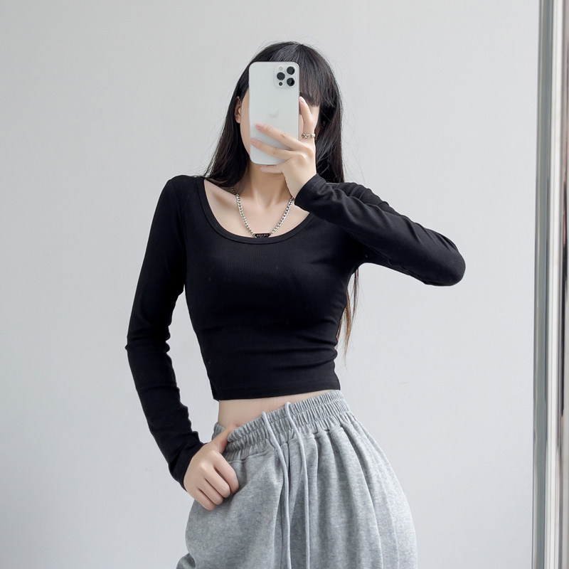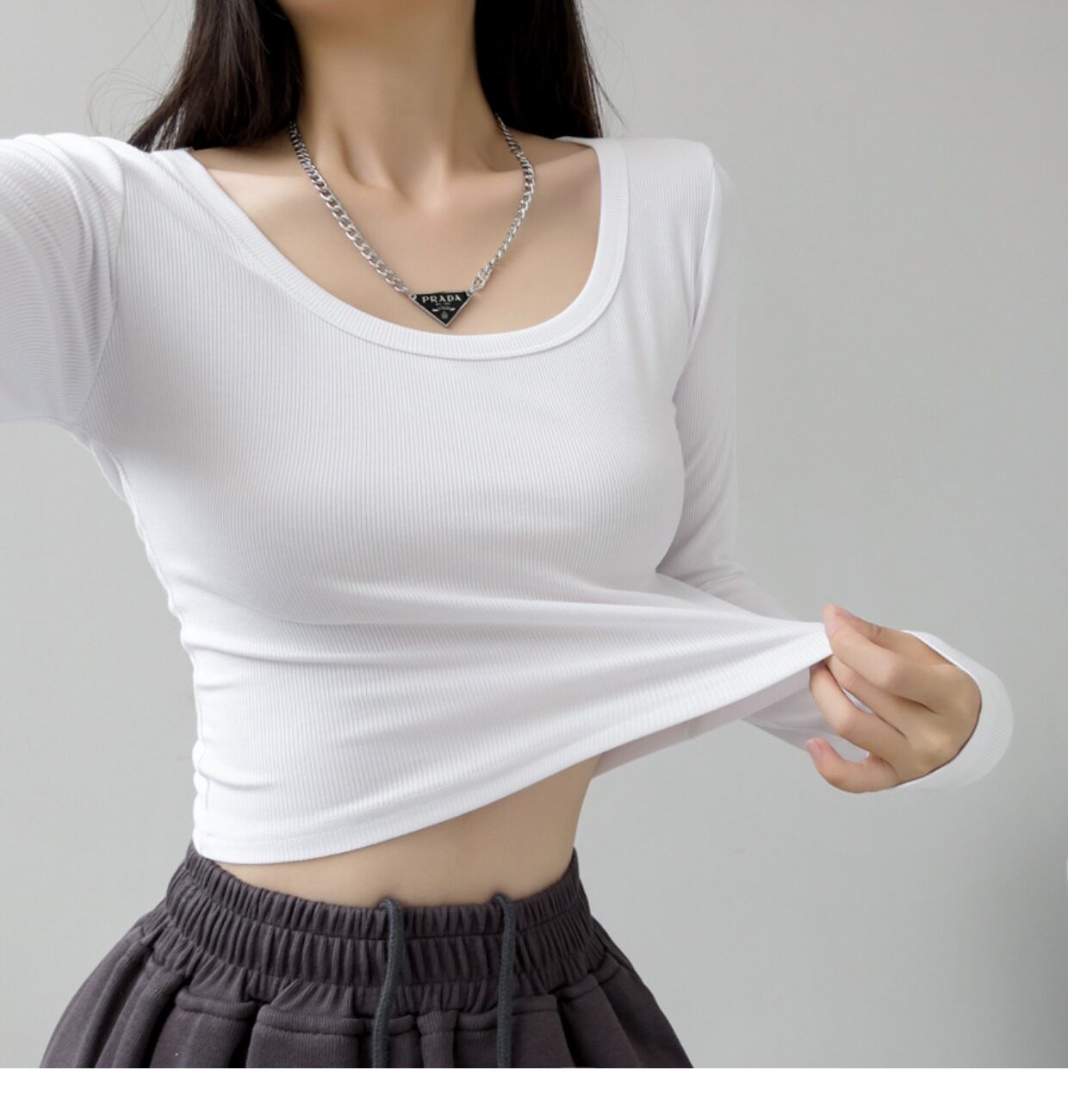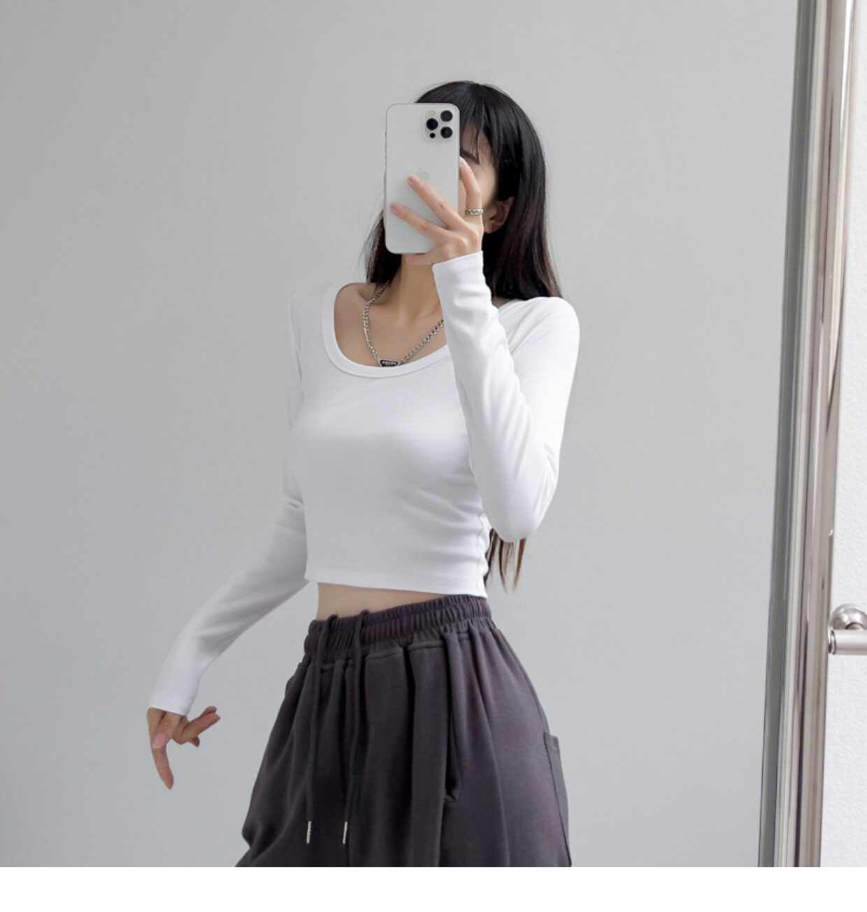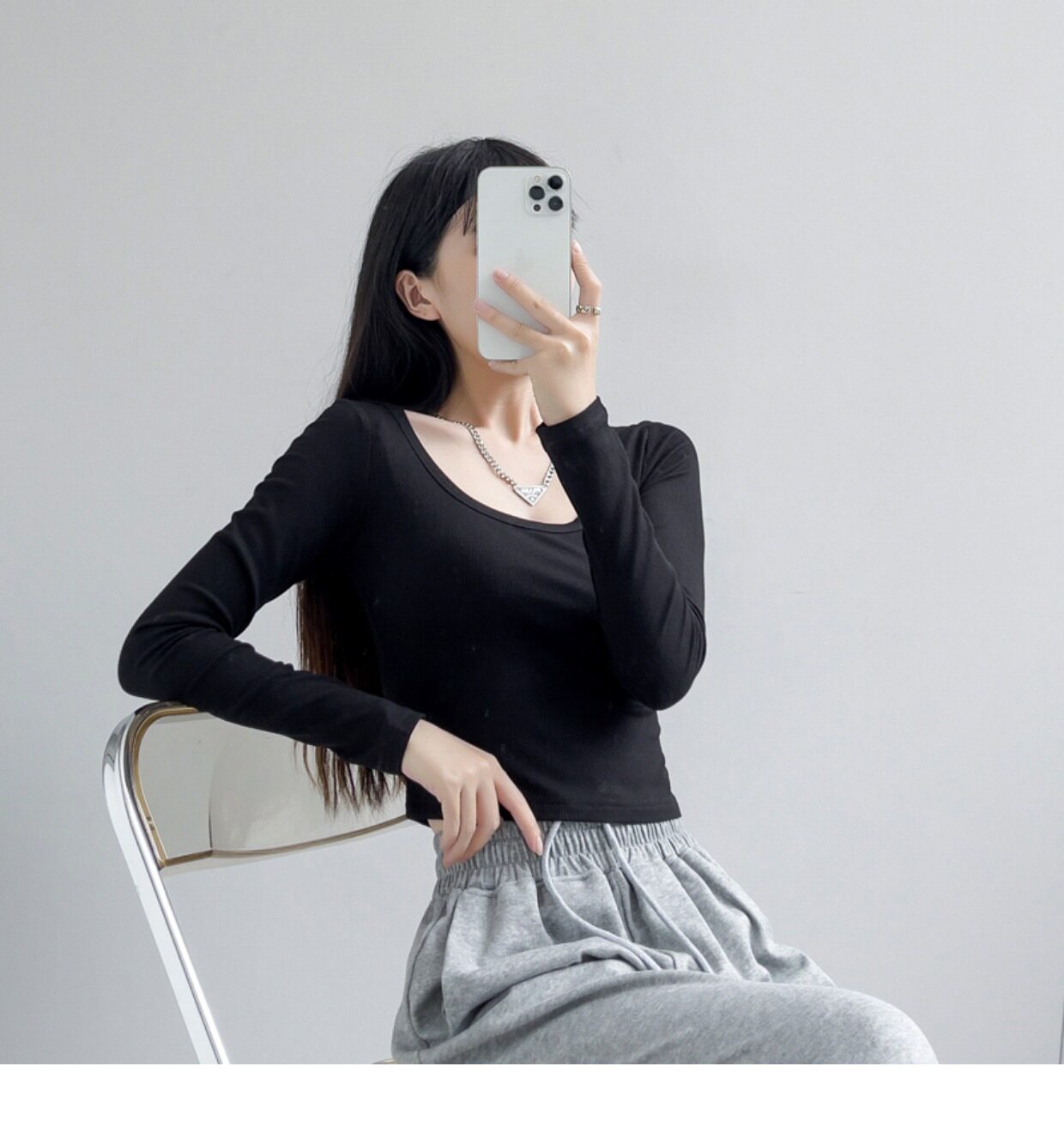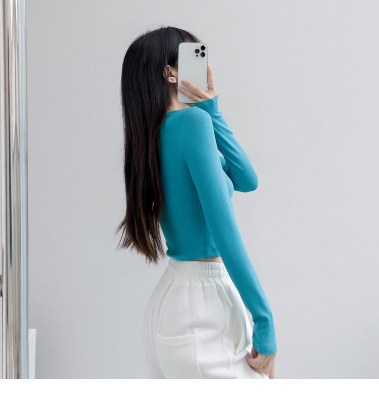 2025 Autumn and Winter Long-Sleeve Tight-Fitting U-Neck Base Shirt in Sky Blue, High-Waisted Short Style, Enhances Bust Appearance, Trendy Inner Wear Top for Women