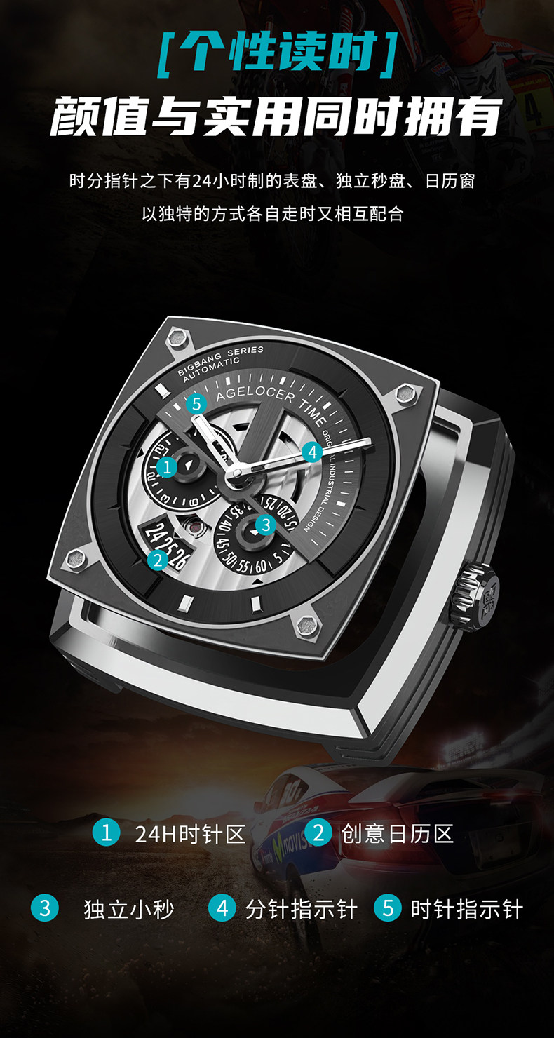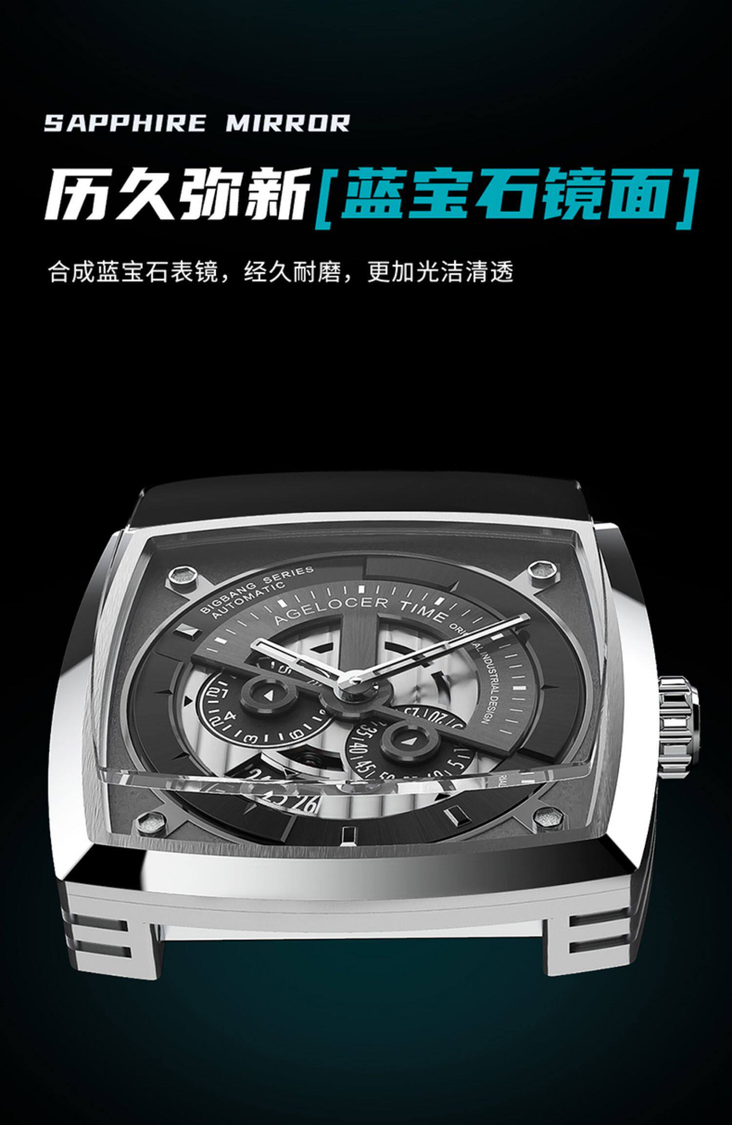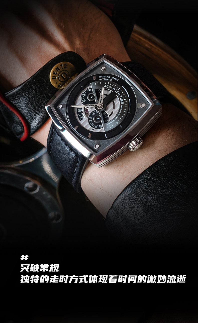 Agelocer original design industrial style square mechanical watch luminous calendar large dial men's watch