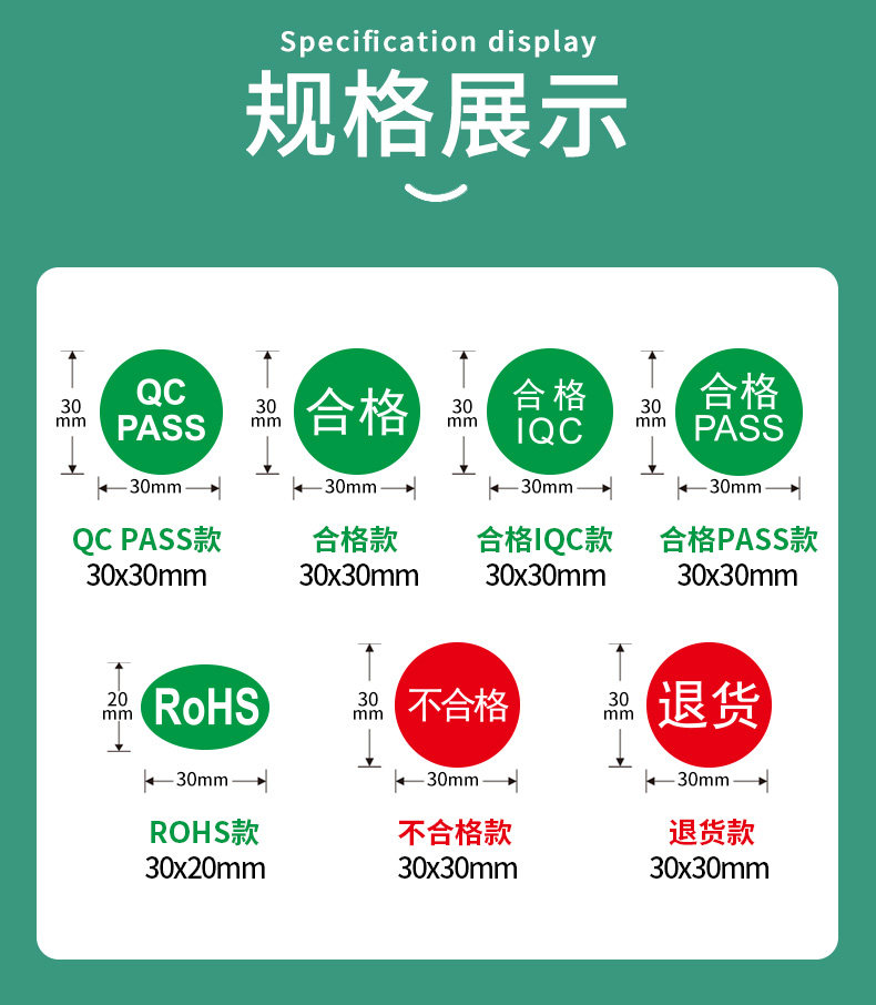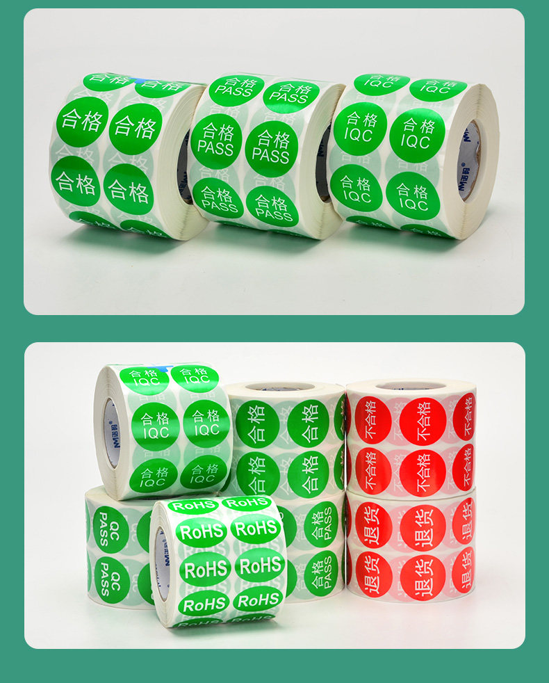 Color Classification [Rohs Green]Oval 12*8*3000 Stickers,[Rohs Green]Oval 15*10*3000 Stickers,[Rohs Green]Oval 20*13*2000 Stickers,[Rohs Green]Oval 25*15*2000 Stickers,[Rohs Green]Oval 30*20*2000 Stickers,[Rohs Green]Oval 50*30*1000 Stickers,[Pass Green]Round 30*30*2000 Stickers,[Substandard, Red]Round 30*30*2000 Stickers,[Qc Pass Green]Round 30*30*2000 Stickers,[Return - Red]Round 30*30*2000 Stickers,[Pass. Approved. Green]Round 30*30*2000 Stickers,[Qualified Iqc Green]Round 30*30*2000 Stickers
