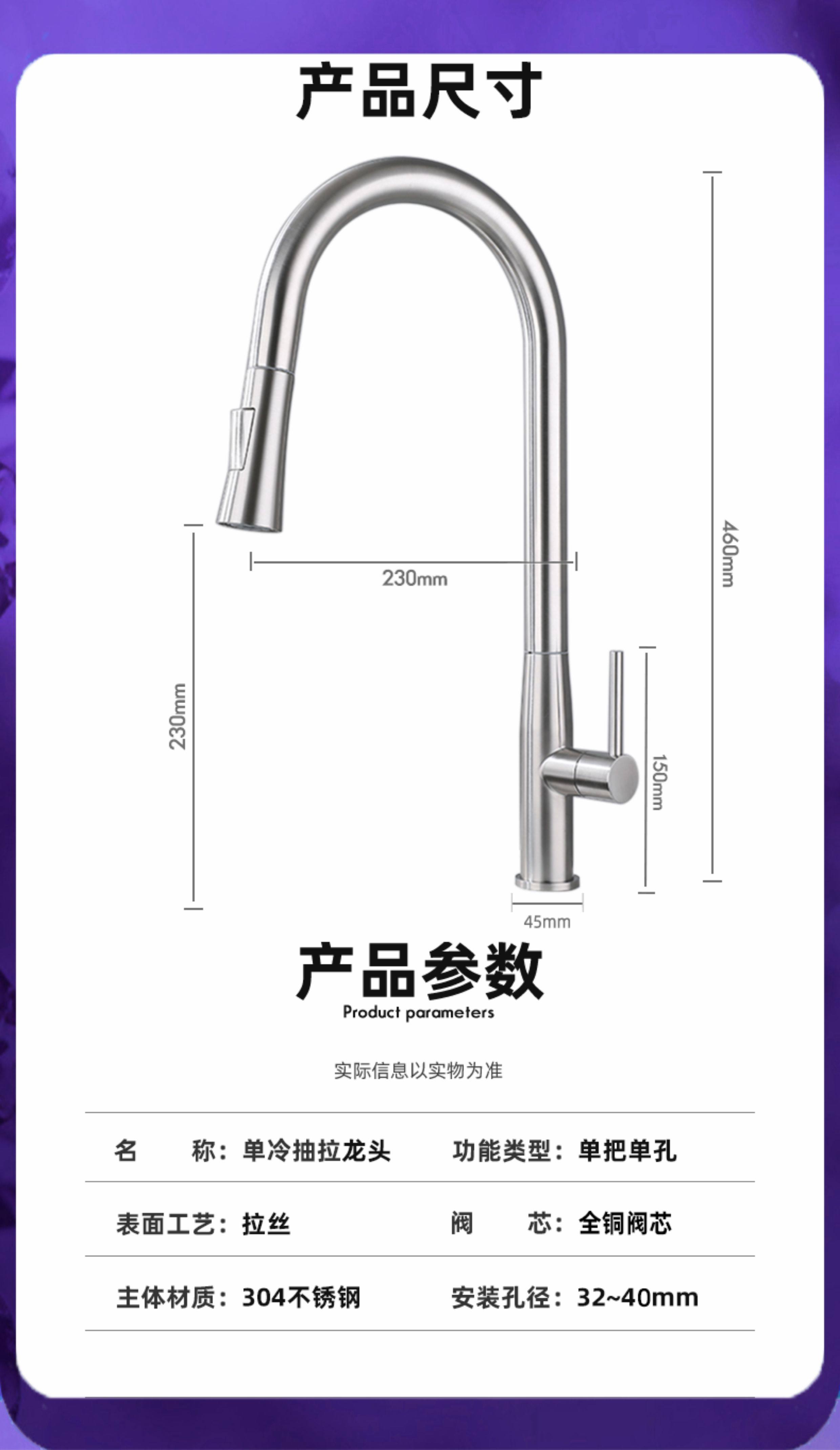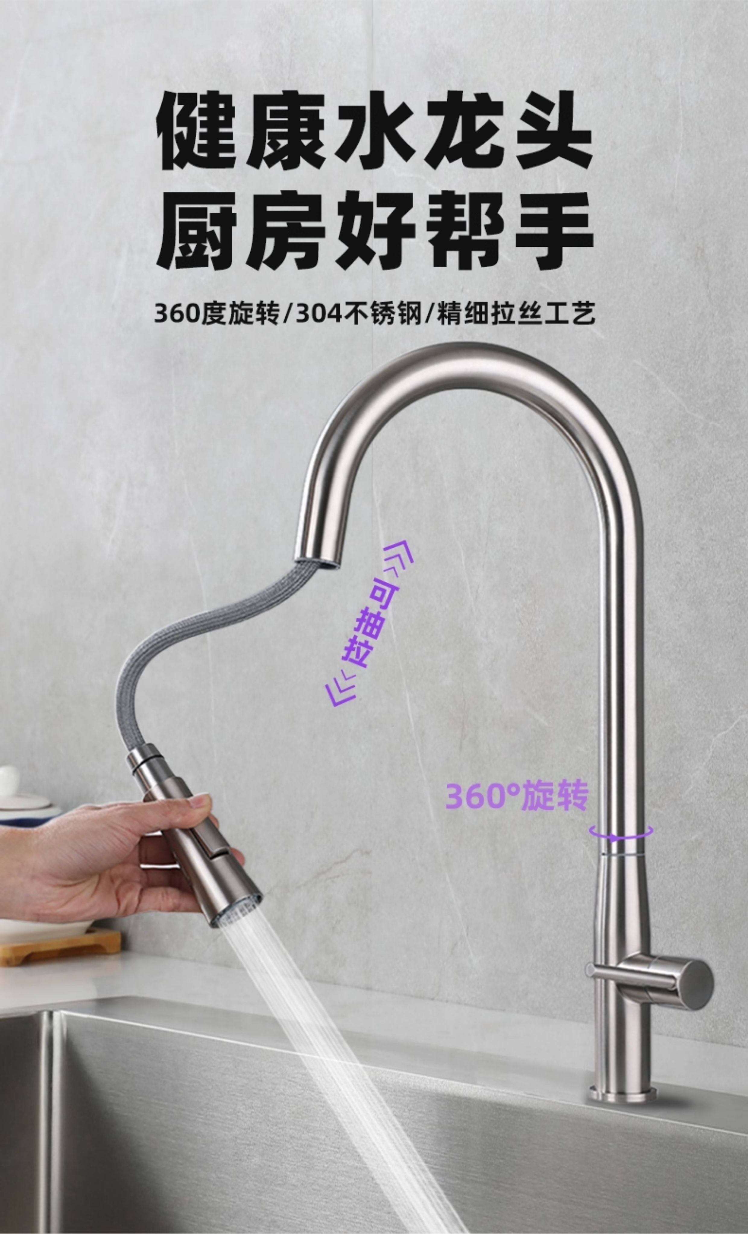 304 Stainless Steel Kitchen Sink Pull-Out Faucet, Household Single Cold Water Sink Faucet, Splash-Proof and Rotatable