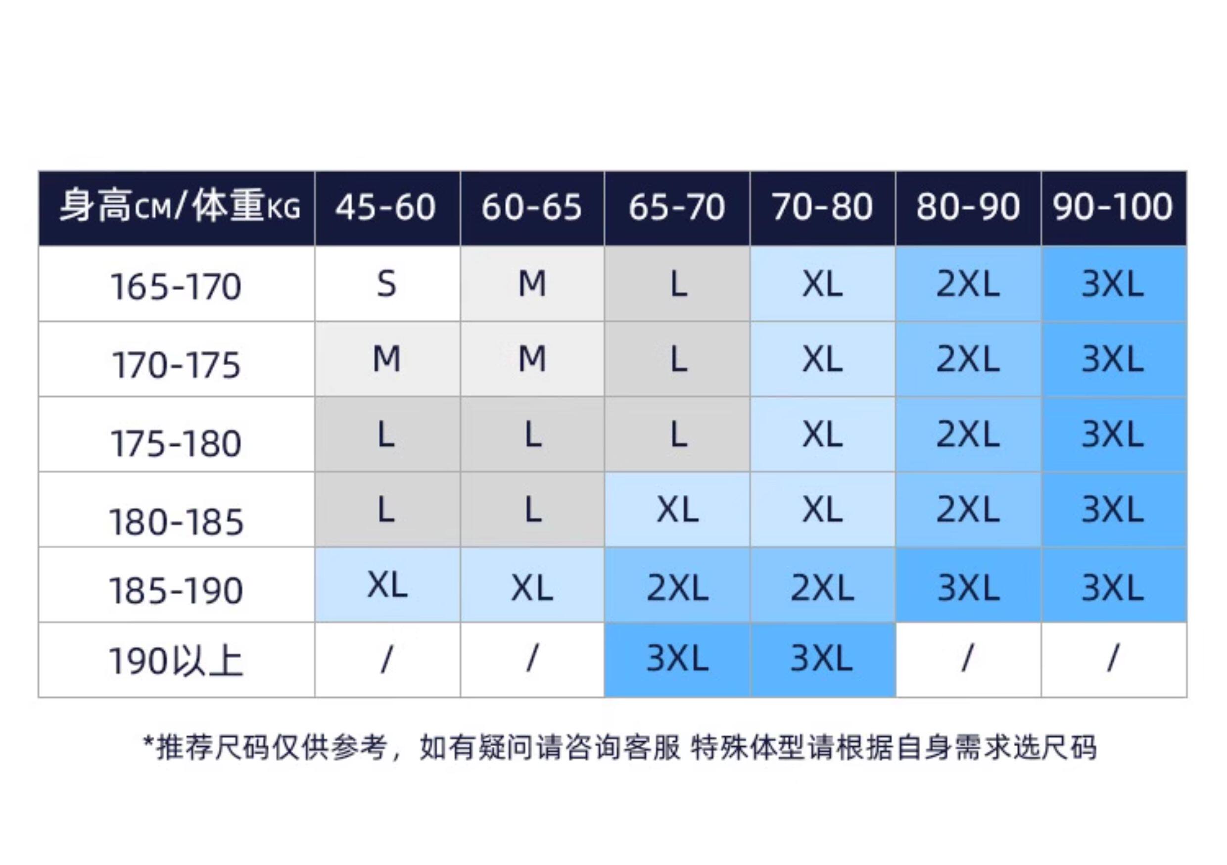China (cm) 165 / 88-90 170 / 96-98 175 / 108-110 180 / 118-122 185 / 126-130