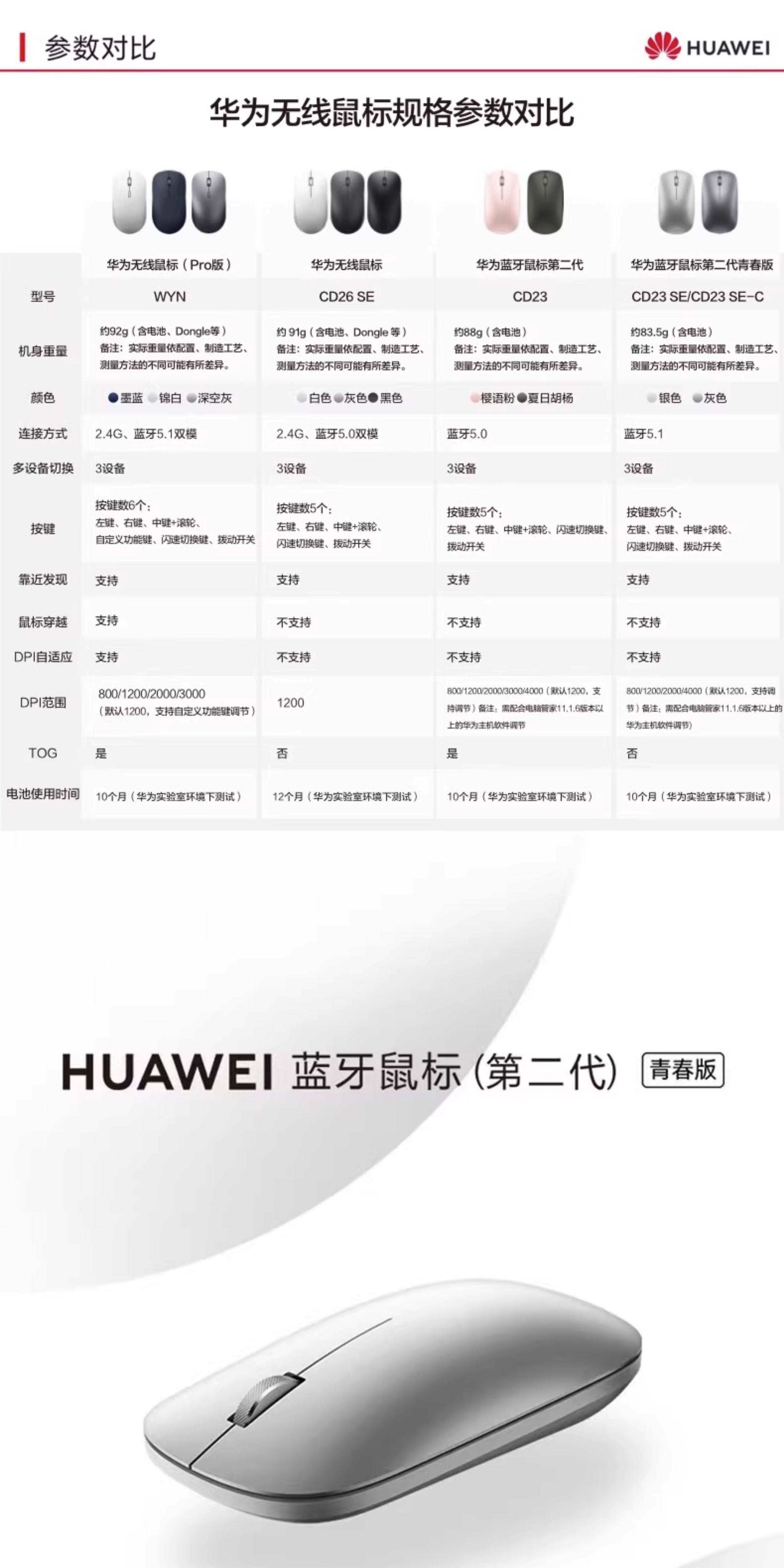 Color Classification Huawei Mouse 2Nd Generation Youth Edition Silver (New, Open Box, Simplified Packaging),Huawei Mouse 2Nd Generation Youth Edition - Gray (New, Open Box, Simplified Packaging),Huawei Mouse 2Nd Generation Youth Edition Silver,Huawei Mouse 2Nd Generation Youth Edition Gray,Huawei Mouse Second Generation Pink,Huawei Mouse 2Nd Generation - Summer Poplar,Huawei Mouse Second Generation Space Gray,Huawei Dual Mode Mouse Youth Edition White (Bluetooth + Wireless),Huawei Dual-Mode Mouse Youth Edition--Gray (Bluetooth + Wireless),Huawei Dual Mode Mouse Youth Edition Black (Bluetooth + Wireless),Huawei Dual-Mode Mouse Pro - Azure White,Huawei Dual Mode Mouse Pro Space Gray,Huawei Dual Mode Mouse Pro Dark Blue