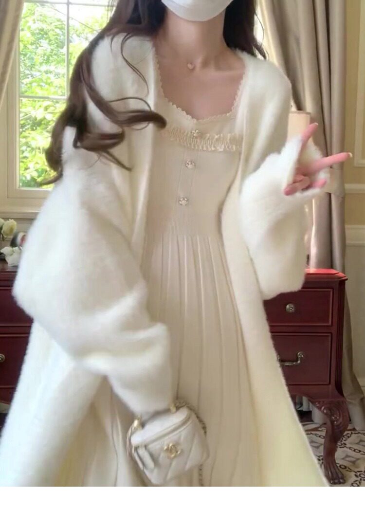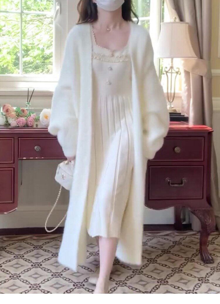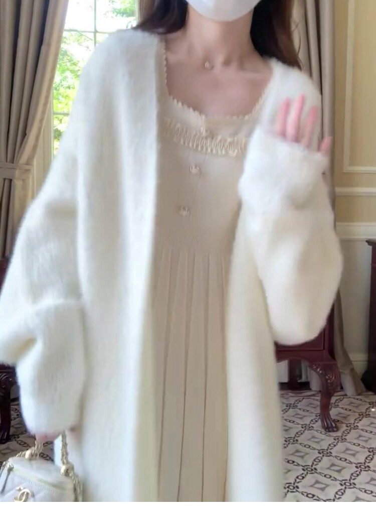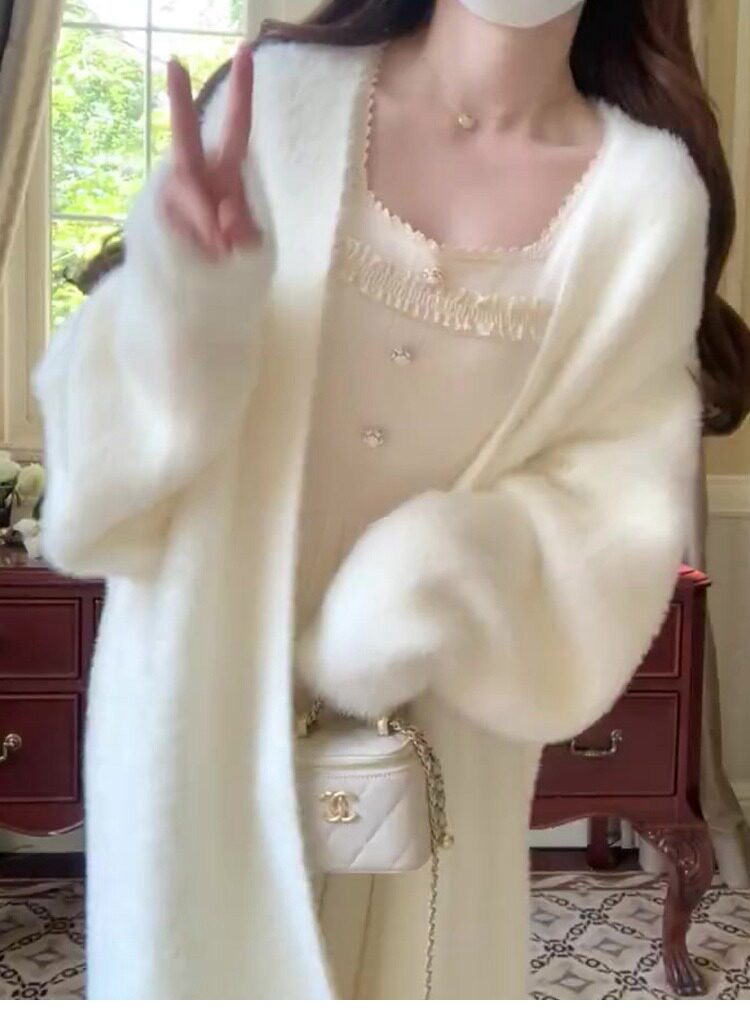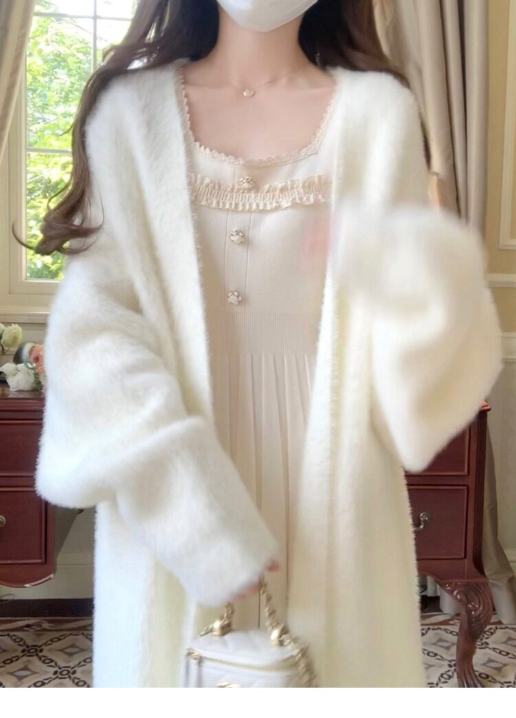 White mink velvet mid-length sweater knitted cardigan for women autumn and winter loose lazy style over the knee coat coat versatile