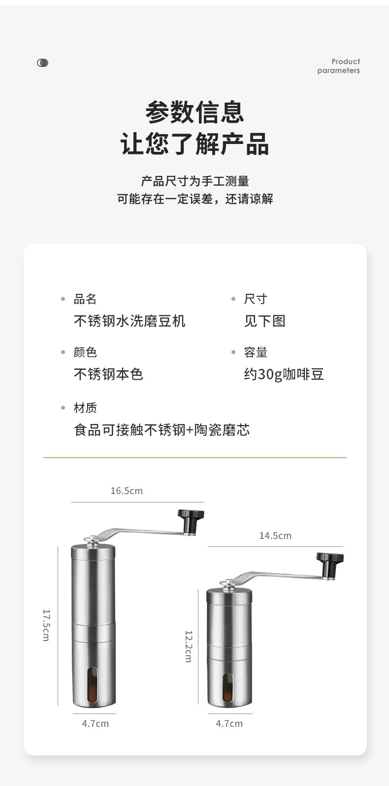 Color Classification Small Stainless Steel Grinder[Free Brush + Measuring Spoon],Large Stainless Steel Grinder[Free Brush + Measuring Spoon],Small Stainless Steel Grinder + Hanging Ears (50 Sheets) Box[Free Brush + Measuring Spoon],Large Stainless Steel Grinder + Hanging Ears (50 Sheets) Box[Free Brush + Measuring Spoon],Large Stainless Steel Grinder + 350ml Flat Lid French Press[Free Brush + Measuring Spoon],Large Stainless Steel Grinder + 600ml Flat Lid French Press[Free Brush + Measuring Spoon],Large Stainless Steel Grinder + 101 Stainless Steel Filter[Free Brush + Measuring Spoon],Small Stainless Steel Grinder + Blue Mountain Beans (454g)[Free Brush + Measuring Spoon],Large Stainless Steel Grinder + Blue Mountain Beans (454g)[Free Brush + Measuring Spoon],Small Grinder + Bean Powder Jar[No Gifts],Large Grinder + Bean Powder Jar[No Gifts],Small Grinder + Little Angel Filter with Cup Holder + 350ml Hand Brewing Kettle[Free Brush + Measuring Spoon],Large Grinder + Little Angel Filter with Cup Holder + 350ml Hand Brewing Kettle[Free Brush + Measuring Spoon],Package 1 (Filter Cup for 1-2 People + Sharing Pot + Grinder + 101V Filter Paper)[Free Brush + Measuring Spoon],Package 2 (Filter Cup for 1-2 People + Sharing Pot + Grinder + 350ml Hand Brewing Pot + 101V Filter Paper)[Free Brush + Measuring Spoon]