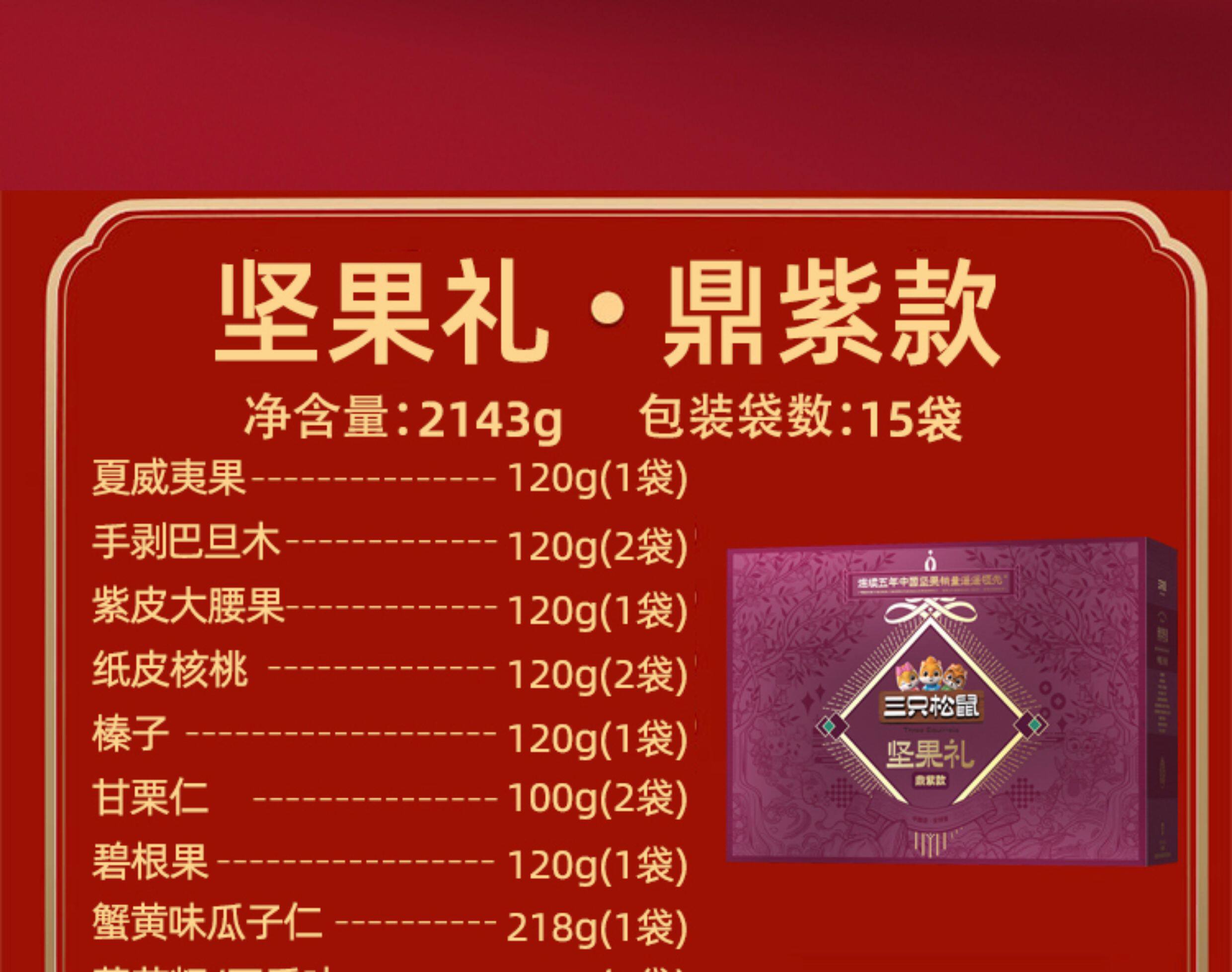 Three Squirrels Purple Edition 2143g/15 Packs New Year's Nut Snacks Gift Box Gift Pack for Spring Festival Gifts with Delivery Available