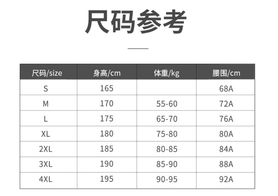 China (cm) 165 / 88-90 170 / 96-98 175 / 108-110 180 / 118-122 185 / 126-130