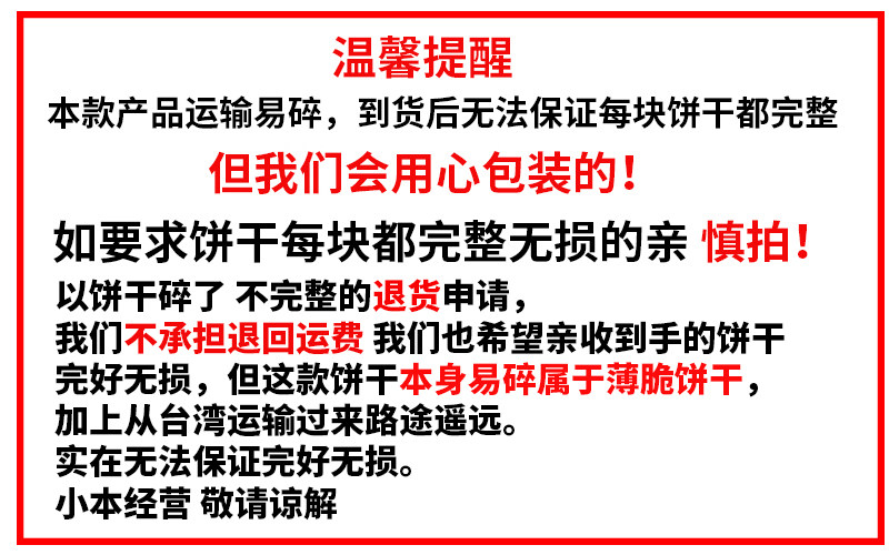 Taste Handle with Care! These Cookies Are Quite Fragile. if You'Re Concerned about Breakage, Please Consider This before Ordering.,Note: the Biscuits Are Fragile, Please Read the Reminder before Purchasing to Avoid After-Sales Service.,[20 Packs] Mixed Flavor 15g (You Can Leave a Message for the Flavor),[25 Packs] Mixed Flavor 15g (You Can Leave a Message for the Flavor),[30 Packs] Mixed Flavor 15g (You Can Leave a Message for the Flavor),[30 Packs] Original Flavor 15g,[42 Packs] Mixed Flavor 15g (You Can Leave a Message for the Flavor),[52 Packs] Mixed Flavor 15g (You Can Leave a Message for the Flavor),【66 Packs】Mixed Flavor 15g (You Can Leave a Message for the Flavor),【66 Packs】Original Flavor 15g,【80 Packs】Mixed Flavor 15g (You Can Leave a Message for the Flavor)