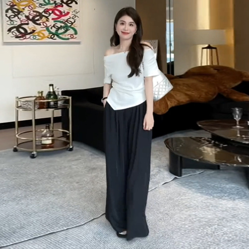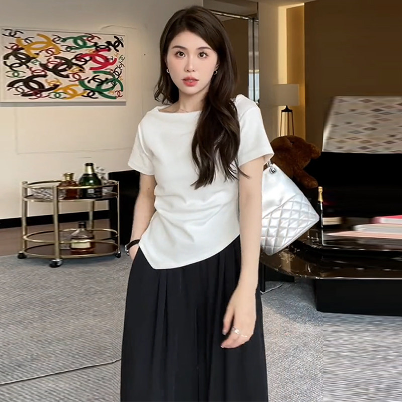 Plus Size Off-Shoulder Short-Sleeve T-Shirt for Women, Summer, Slimming, Irregular Exposed Shoulder, Niche Style, Trendy Top
